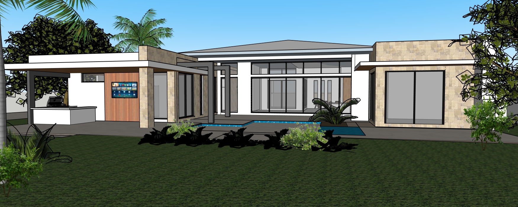 create a hyper realistic exterior photograph of a modern house rear exterior during a vibrant sunny day the house has a sleek tropical modern design with crisp white walls contrasted by some coral stone walls large glass windows reflect the clear blue sky palm trees with their lush green fronds add a tropical touch the house has surrounding green lawn the atmosphere is tranquil and luxurious with sunlight casting gentle shadows evoking a sense of relaxation and opulence