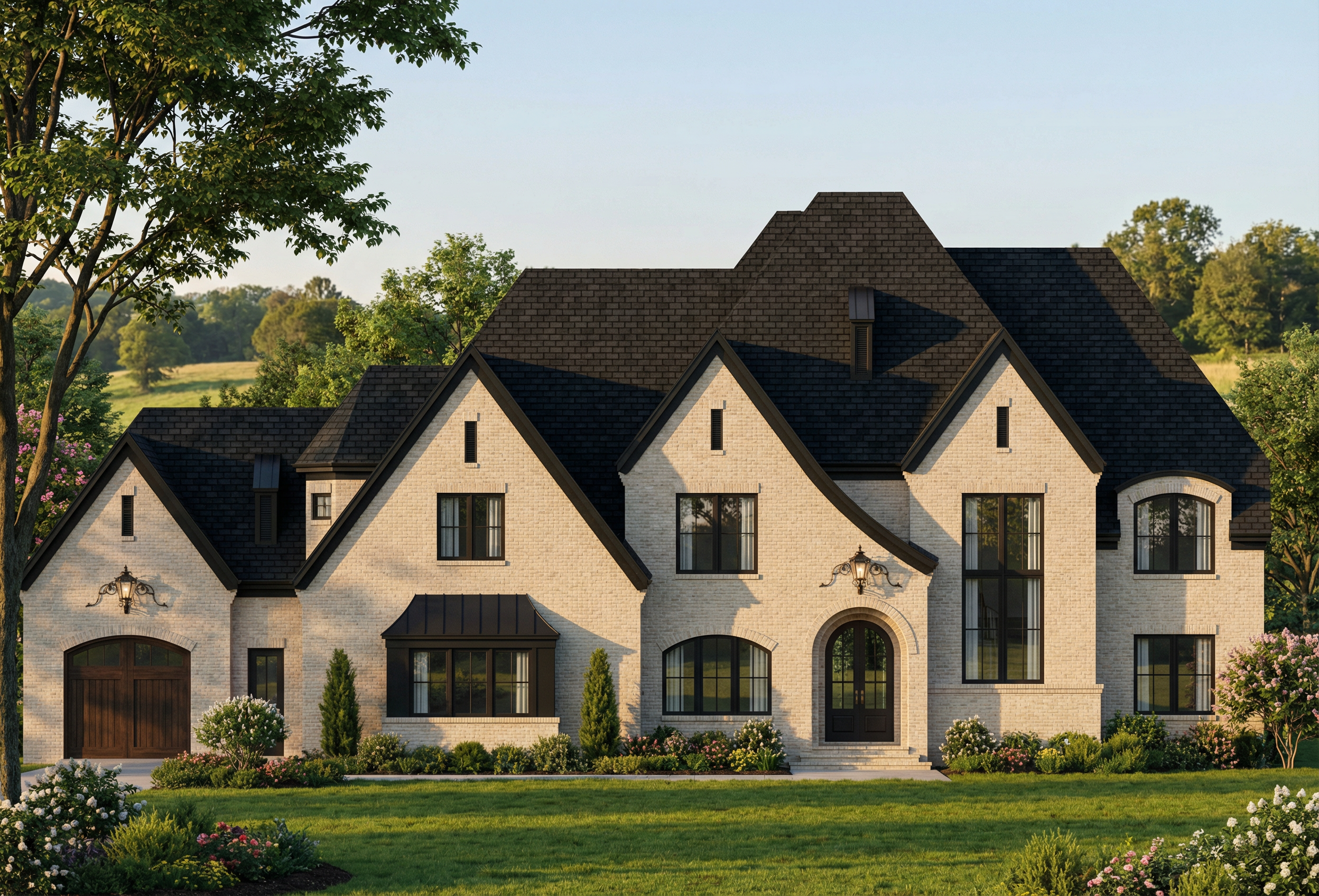 render to make look realistic white painted brick witch white trim soft lighting and overall cottage aesthetic siding above porch not brick forehground lightin not too strong