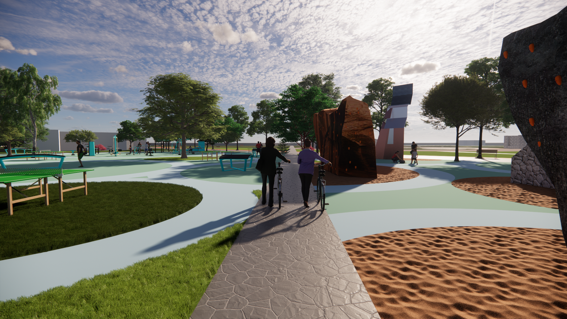wide angle exterior architectural visualization of project description midday neutral cool natural daylight no artificial lighting visible balanced exposure medium low saturation controlled contrast corporate architectural photography style no cinematic effects no dramatic sky no warm tones clear pale blue sky with minimal soft clouds vegetation in muted olive green tones low vibrancy landscaping engineered and maintained environment clean materials without wear clear material differentiation architectural mass reads before texture subtle structural emphasis systemic spatial clarity investor oriented tone subtle emotional trigger of stability and competence ultra realistic high resolution professional architectural documentation style no sunset lighting no golden hour no warm color cast no cinematic atmosphere no dramatic fog no lens flare no oversaturated colors no lifestyle staging no artistic grain no excessive depth of field blur