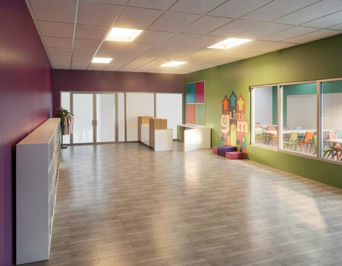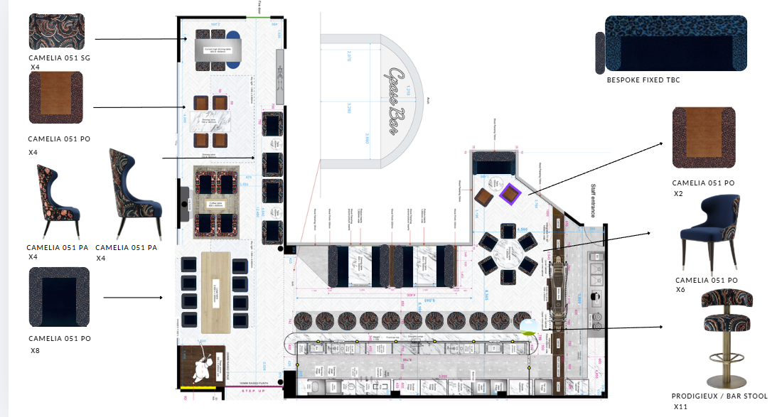 bar with barstools and seating make interiors like its space but neon pinks in graphics on walls and astronaughts