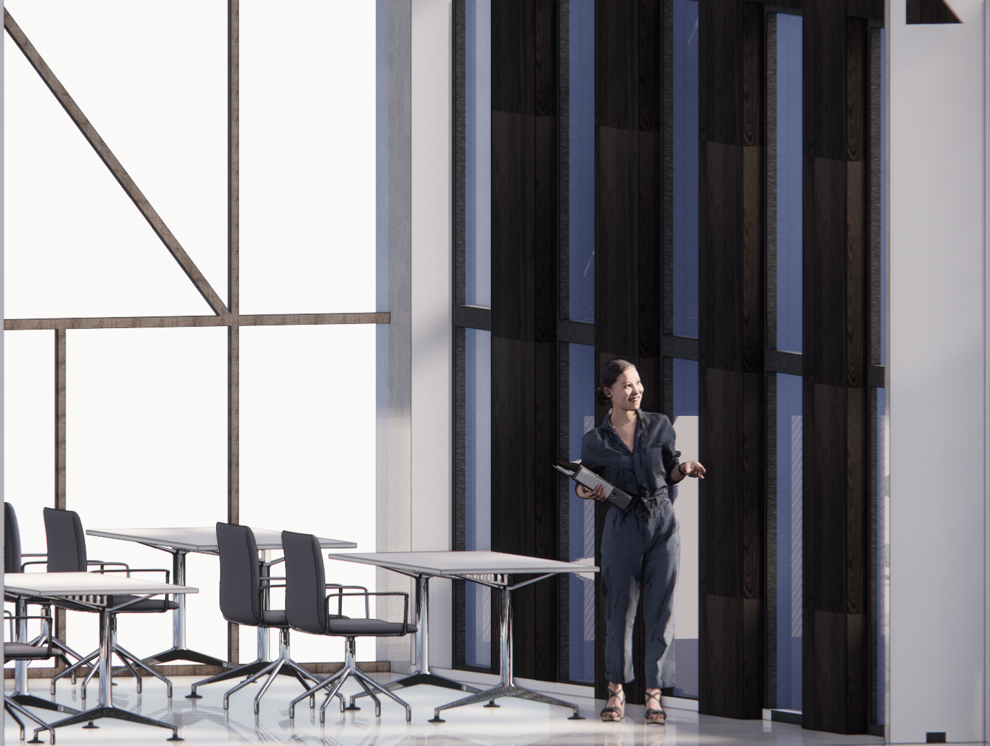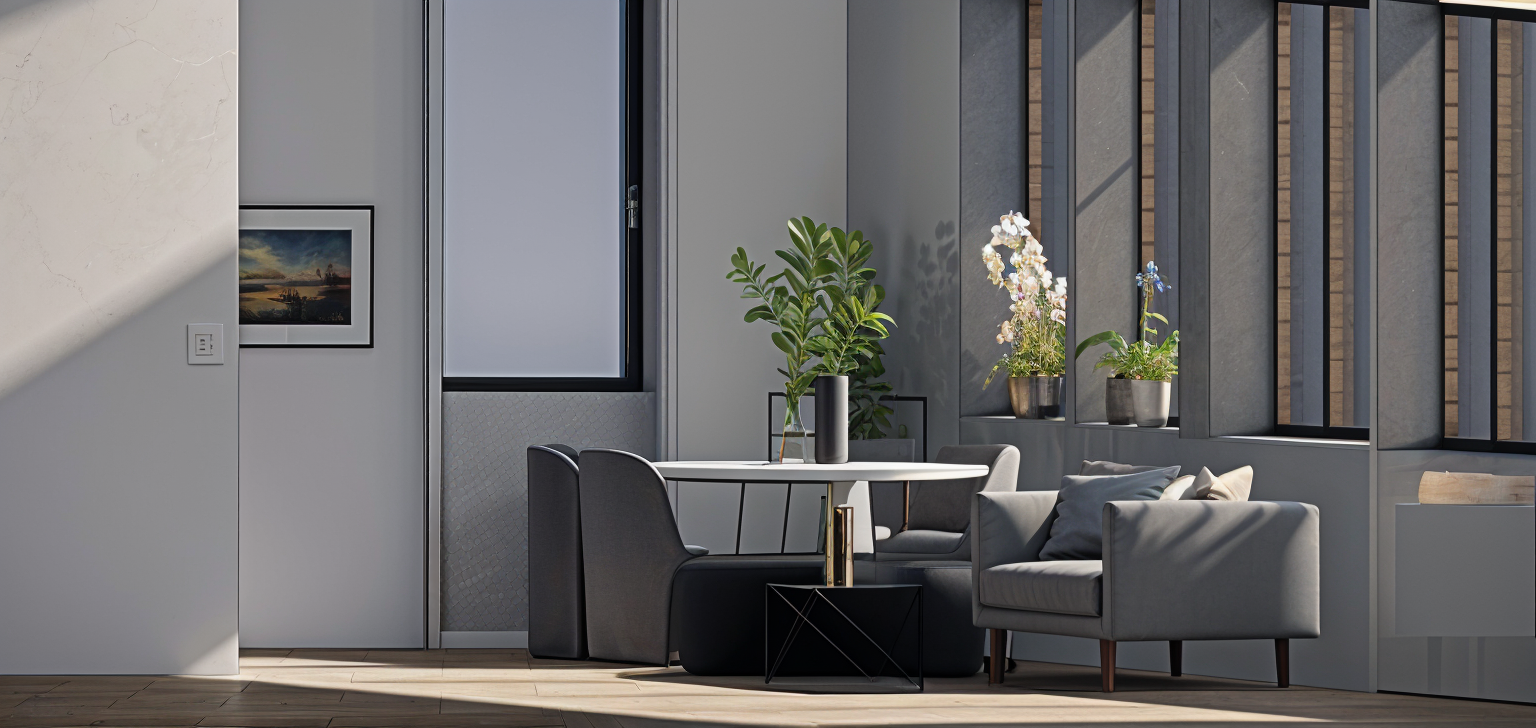 modernist perspective shot realistic outzoomed room concrete ceiling architecture