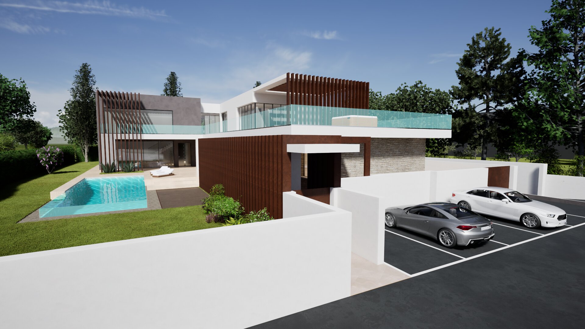 photo of a modern residential villa with sleek lines and contemporary features showcasing a blend of glass stone and steel corten elements