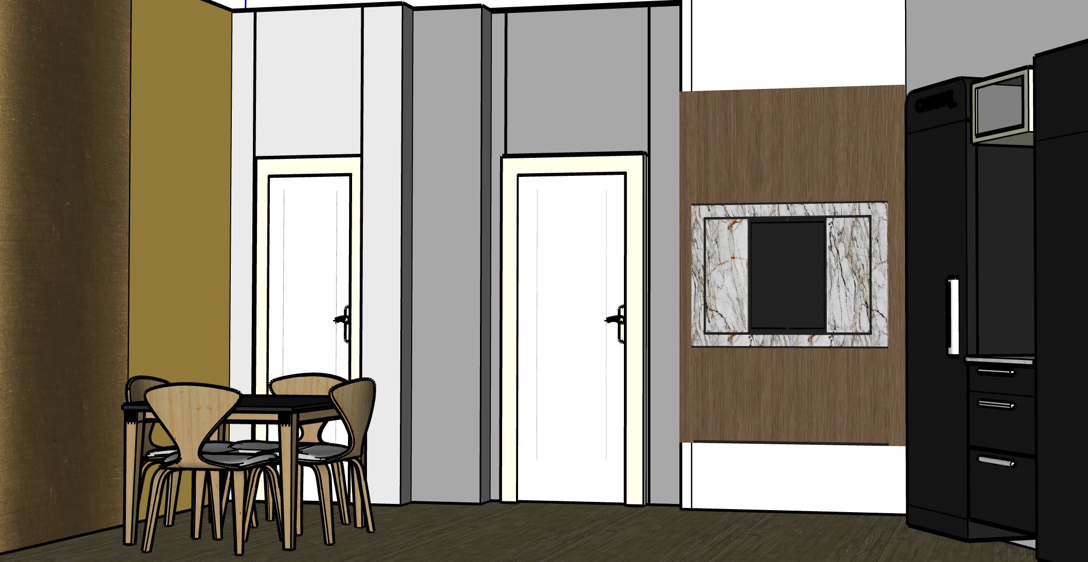 international style interior shot luxurious wooden floor chairs and lunch table white doors tv wall dark kitchen to the right architecture