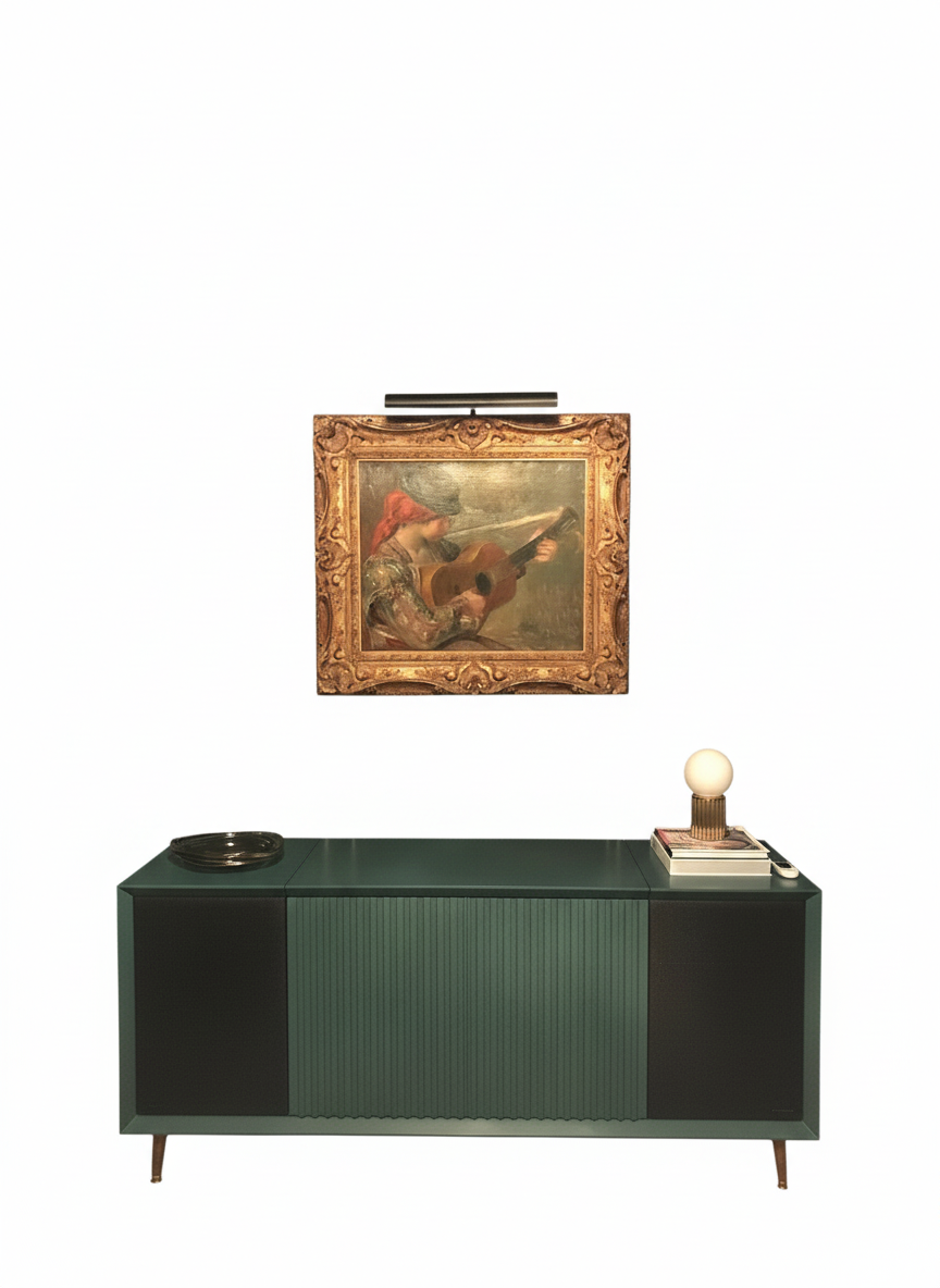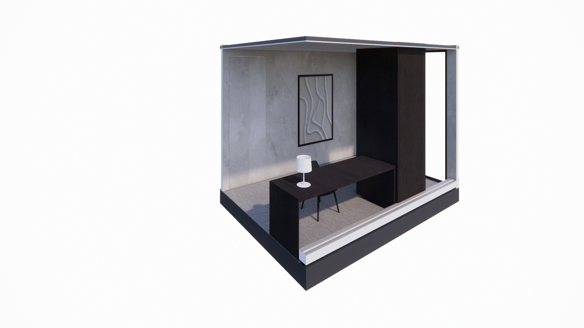 provide a photorealistic rendering keep all the elements proportions and materials as they are provide daylight add table lamp with bronze base do not add any reflections