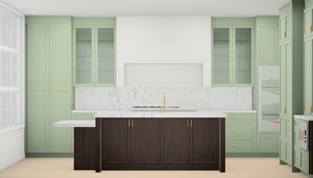make more photo realistic glass will have ribbed texture add flush arch to the white wall above the range add more detail to the cabinet hardware make double wall ovens thermador brand make floors more of a warm white oak