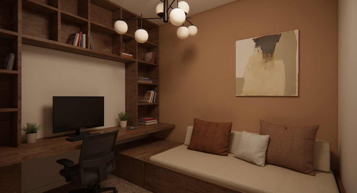 make the wood a light beige color add books and decorative elements on the shelves add a computer screen add a backrest make the image more realistic turn on the ceiling lights