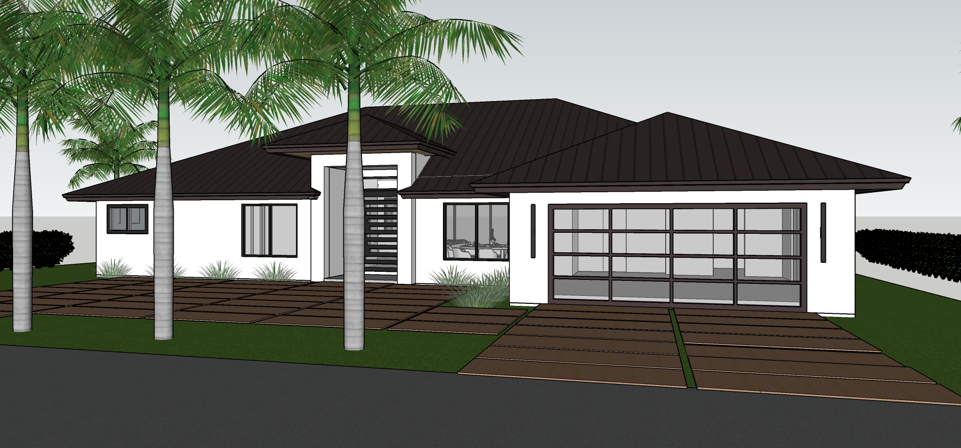 exterior shot high quality photo realistic of a beautiful sunny day with blue sky luxury tropical suburban landscape located in florida smooth white stucco walls slightly brown color for pavers with a light wet reflection