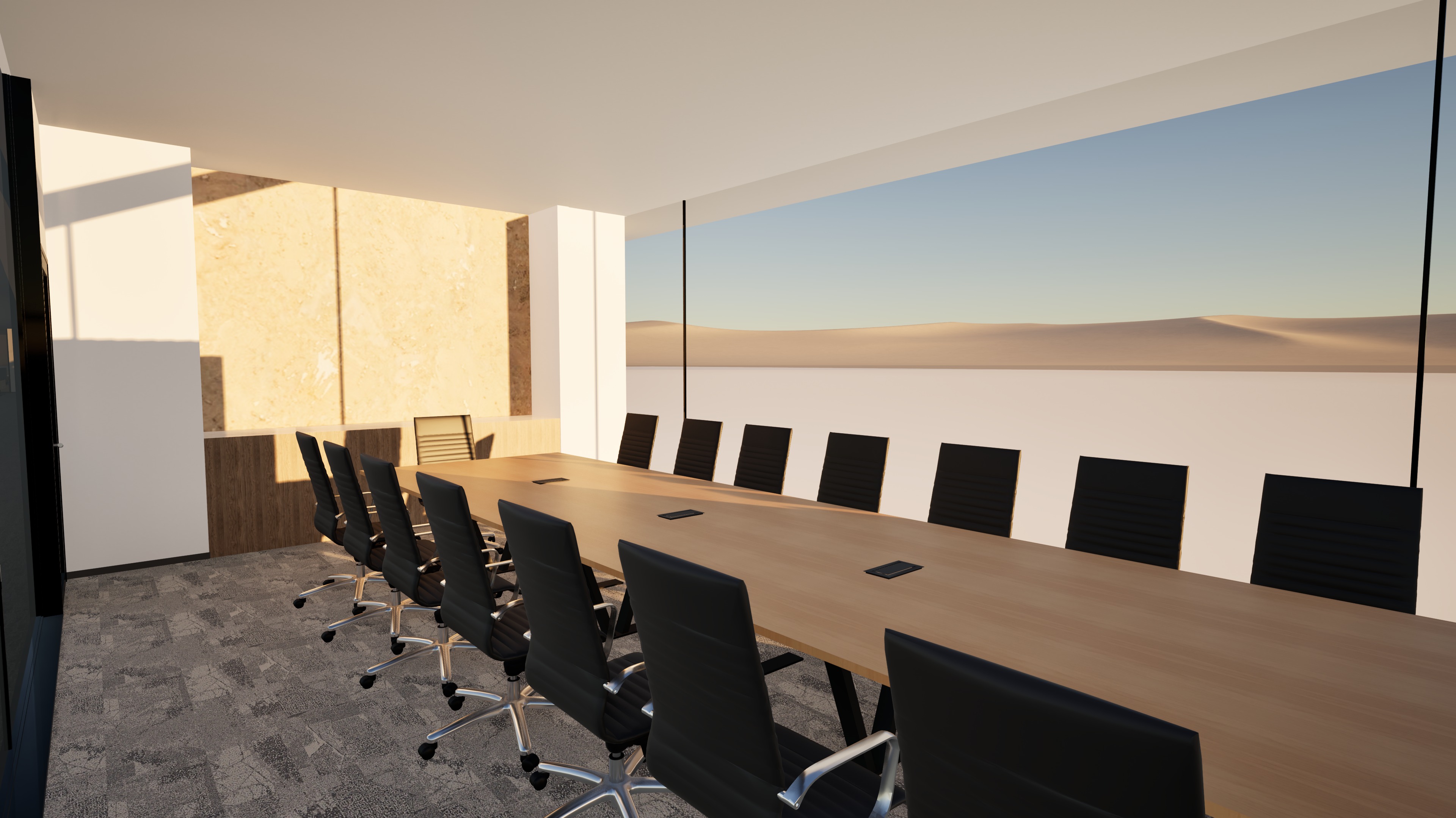 add decor make more realistic add someone sitting at the desk do not change any of the furniture or materials improve the lighting and reduce shadows add a parking lot out of the window view but the room is on the seventh floor