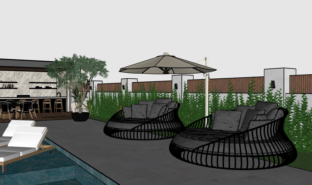 mantenha as texturas originais adicione paisagismo no fundo bem distante apos o muro de divisa com arvores grandes as arvores devem estar do outro lado do muro nao dentro do terreno principal a arvore do vaso no piso um pe de jaboticaba
