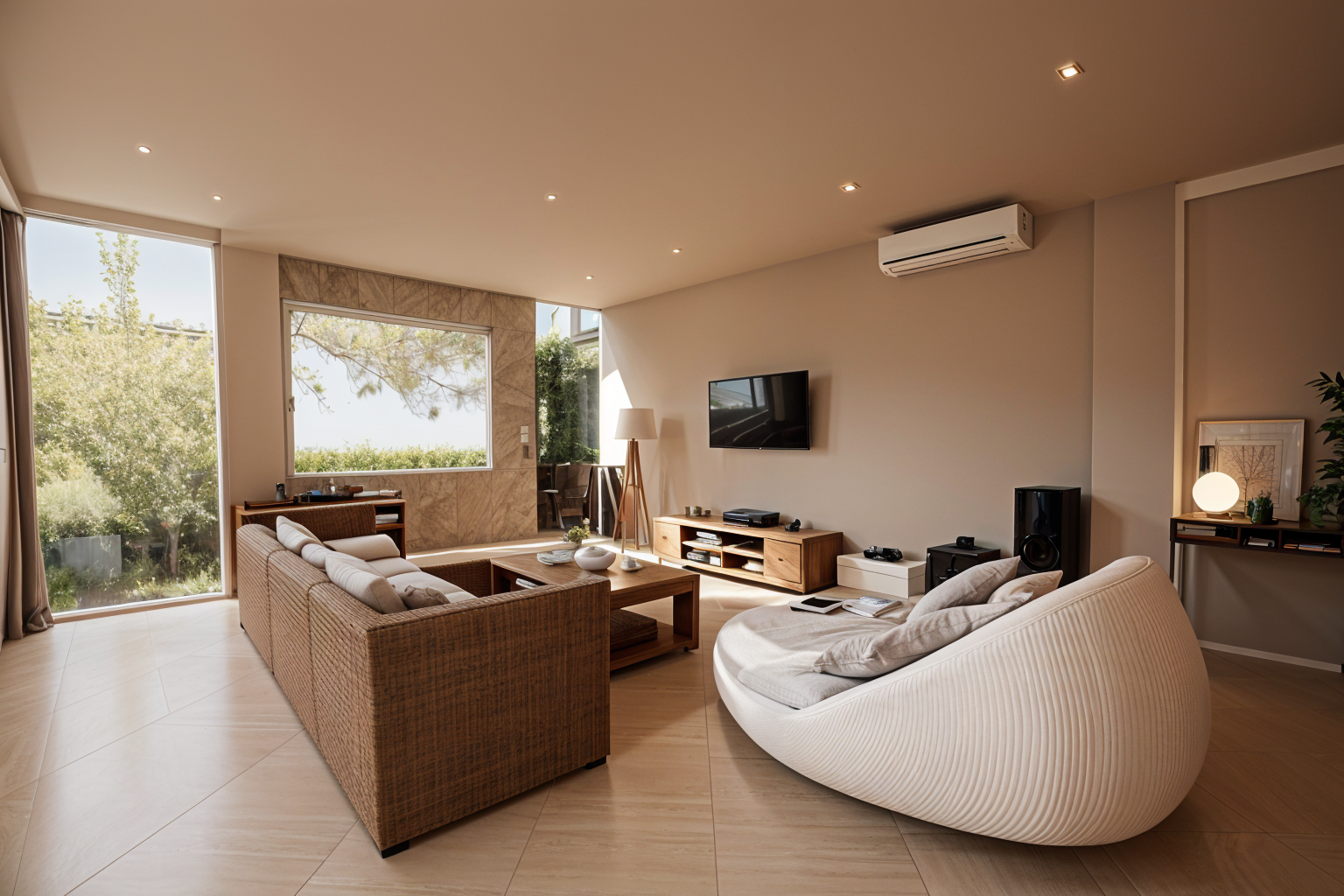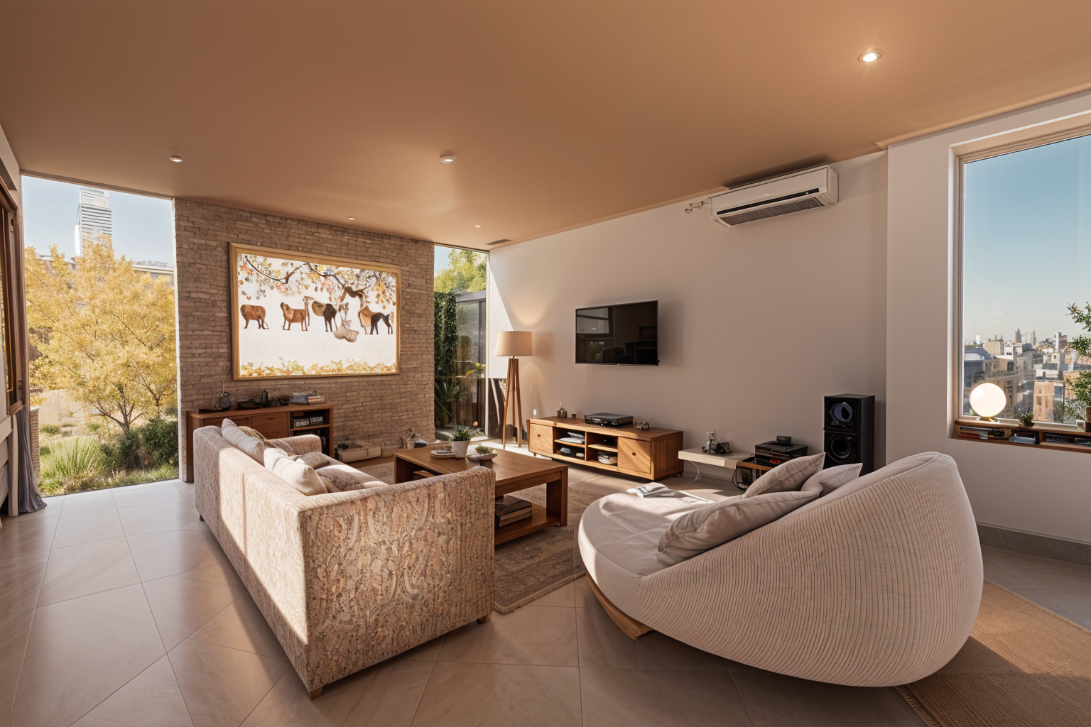 interior shot enhance the existing interior with a modern style in a warm sophisticated tone make the room cleaner and more minimal maintain the original composition and angle of view