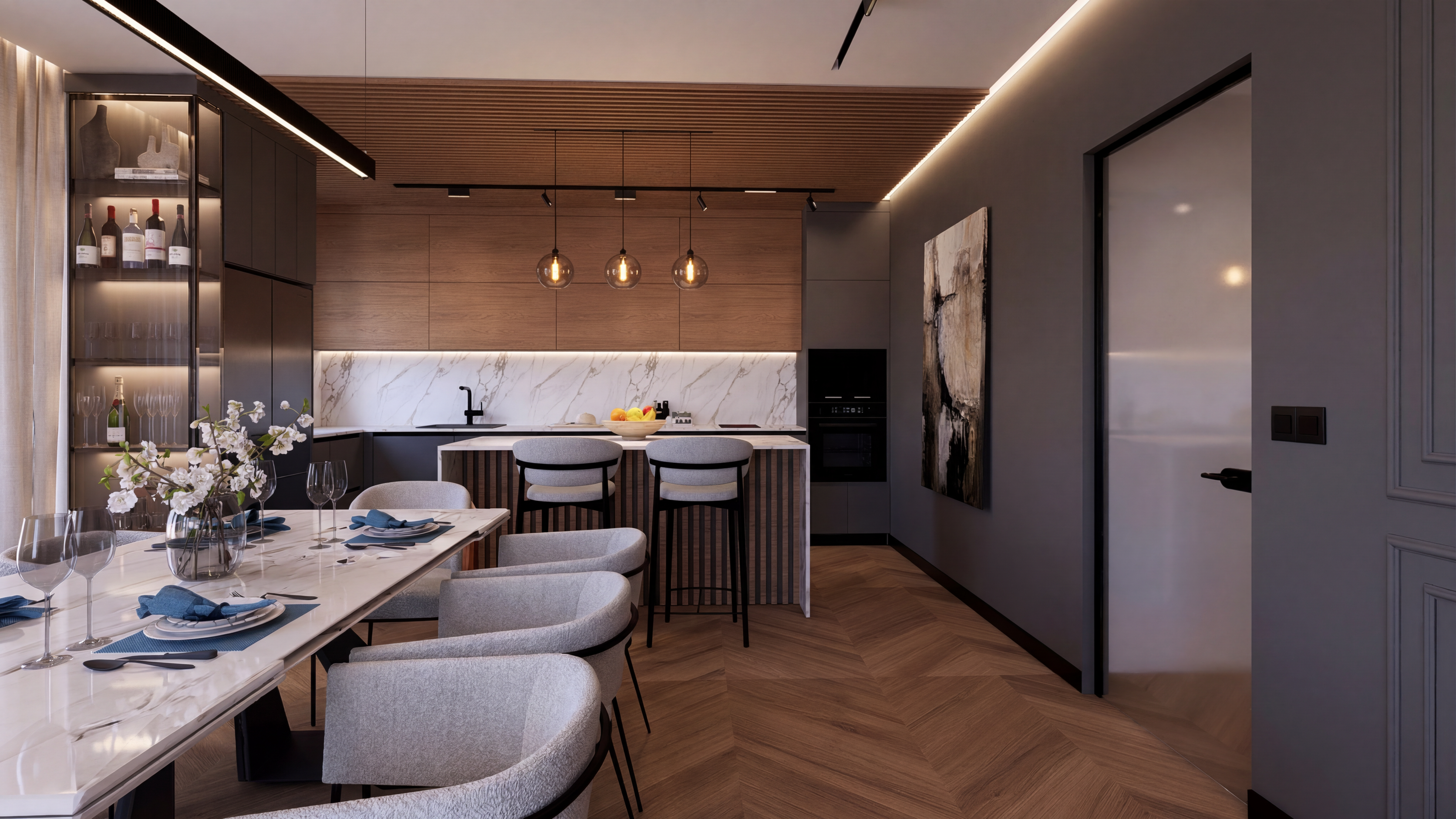 transform this internal view into a realistic render the image shows a gaming room with feature hexagon side panelling with back lighting