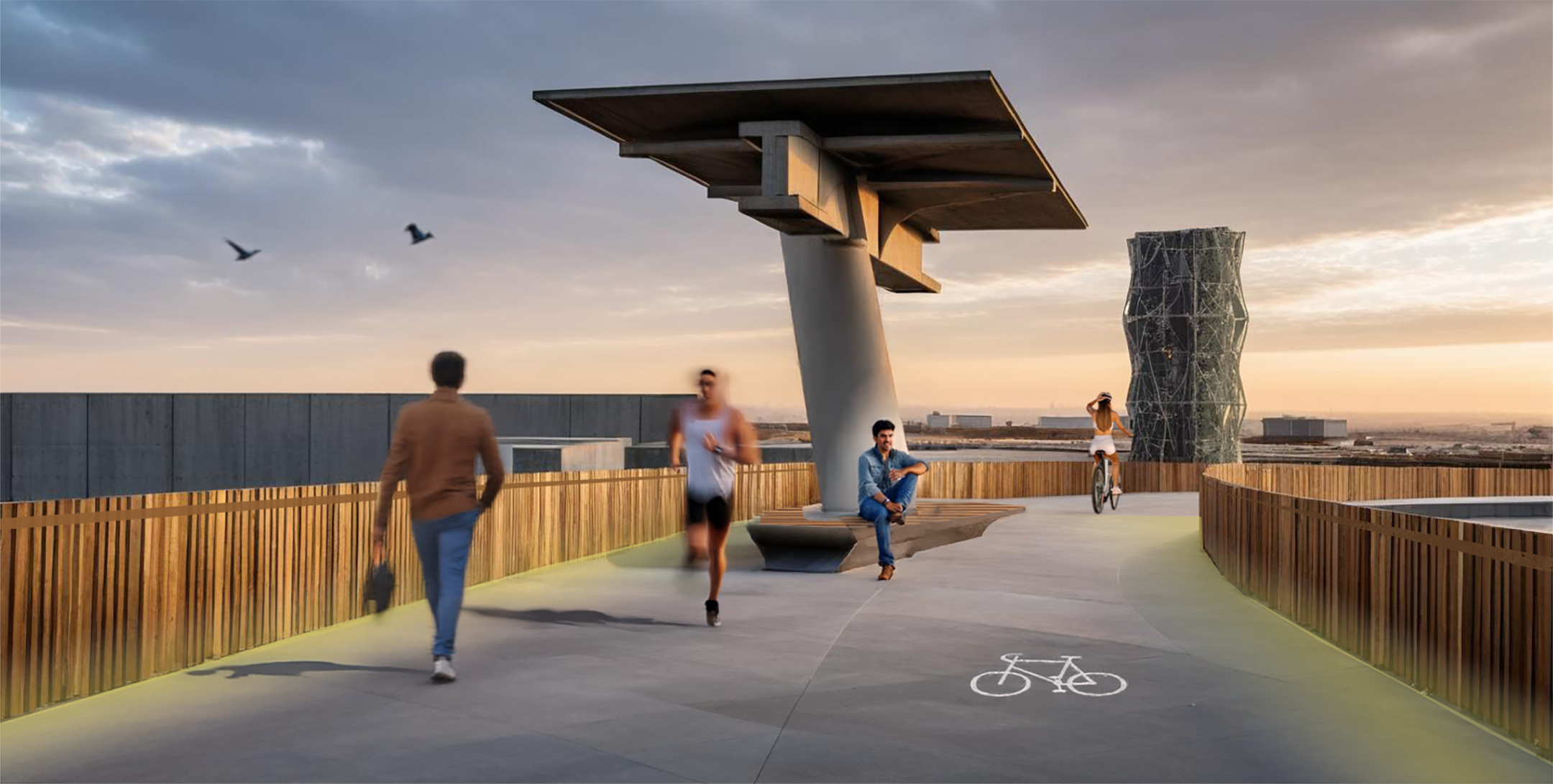 photorealistic image of people walking on a curved bridge overlooking an industrial city with a sculptural canopy bench and a glass geometric tower in the background