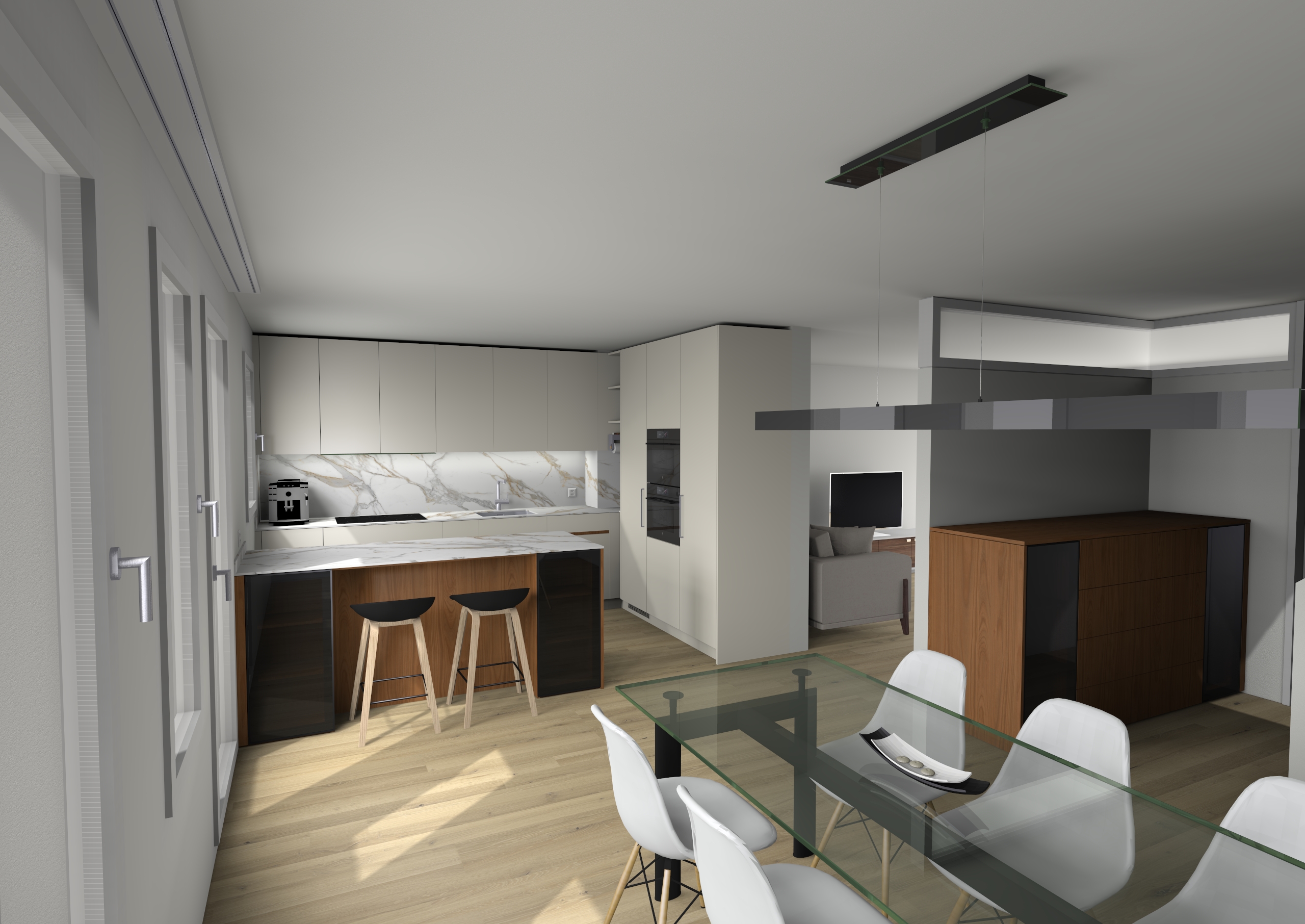 modern open plan kitchen and dining interior scandinavian minimalist design maintain exact geometry camera perspective and architectural layout no changes to kitchen walls windows or built in elements preserve original material definitions and color fidelity super matte off white kitchen fronts natural cherry wood semi matte oiled finish for island and cabinetry light oak flooring white marble with subtle gray veining for backsplash and countertop black accents introduce a slightly warmer soft natural lighting atmosphere without becoming dramatic or overly stylized simulate gentle late afternoon daylight entering from the left side windows maintaining realistic shadow behavior and balanced exposure avoid strong color shifts over saturation or contrast exaggeration enhance photorealism with refined global illumination accurate reflections especially on glass dining table and smoked glass cabinet doors and high quality material texture definition subtly decorate the kitchen add minimal tasteful accessories such as a few ceramic vases a wooden cutting board a linen towel and sparse greenery e g herbs or a small plant keeping a clean high end aesthetic the four cabinets with smoked glass doors must be internally styled and filled with elegant realistic contents e g neatly arranged glassware ceramics and a few curated decorative objects visible through the tinted glass while respecting its material properties maintain a restrained premium architectural visualization style no clutter no changes in structure no redesign of elements