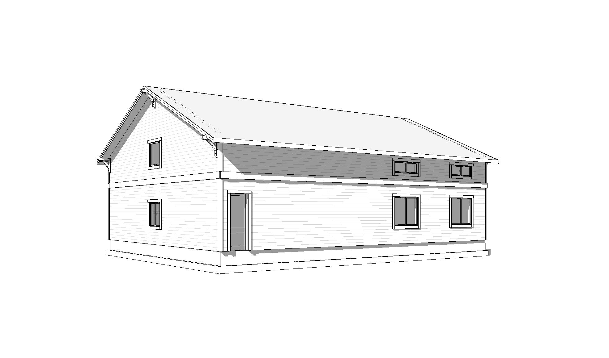 clean modern barndominium architectural exterior home rendered in cinematic vibrant golden hour lighting with blue skies and vibrant clouds barndominium in a lush beautiful forest setting with green grass and dense trees surrounding the property warm glow and reflections off of the windows select grade horizontal white hardie siding green manicured landscape around structure with gardens and grass black standing seam metal roof high fidelity photorealistic visualization crisp shadow falloff refined facade geometry soft atmospheric depth premium architectural photography mood ultra clean composition and materials photorealistic render black trim around the windows and doors prominent trees scattered around the property black window trim and posts white belly band black corbels hide concrete foundation