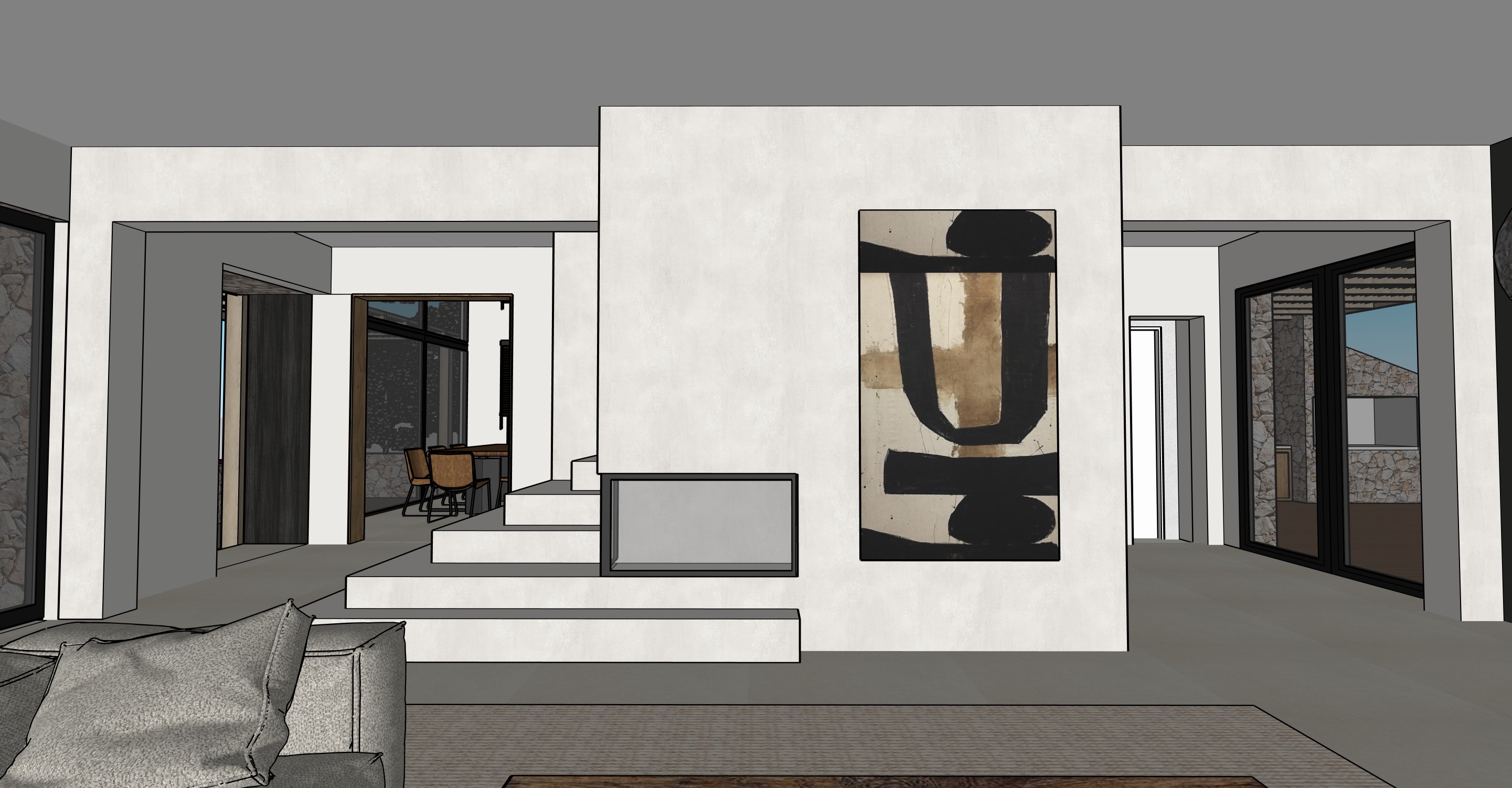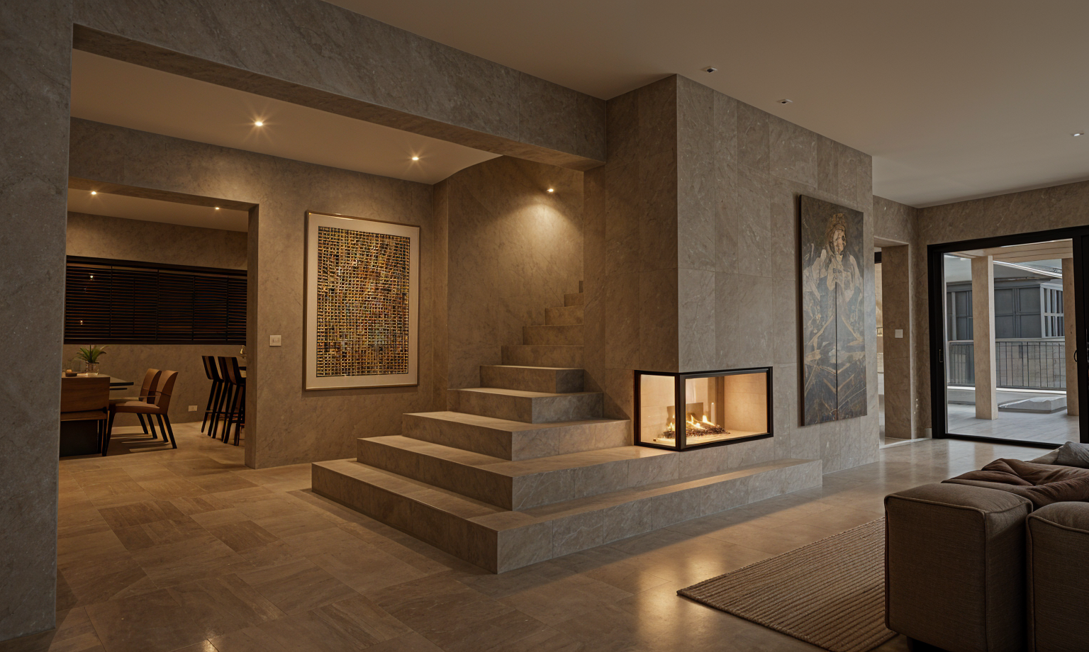 flooring with marazzi white travertino cross 100x100 warm white lime painting in walls add warm kighting in the background room