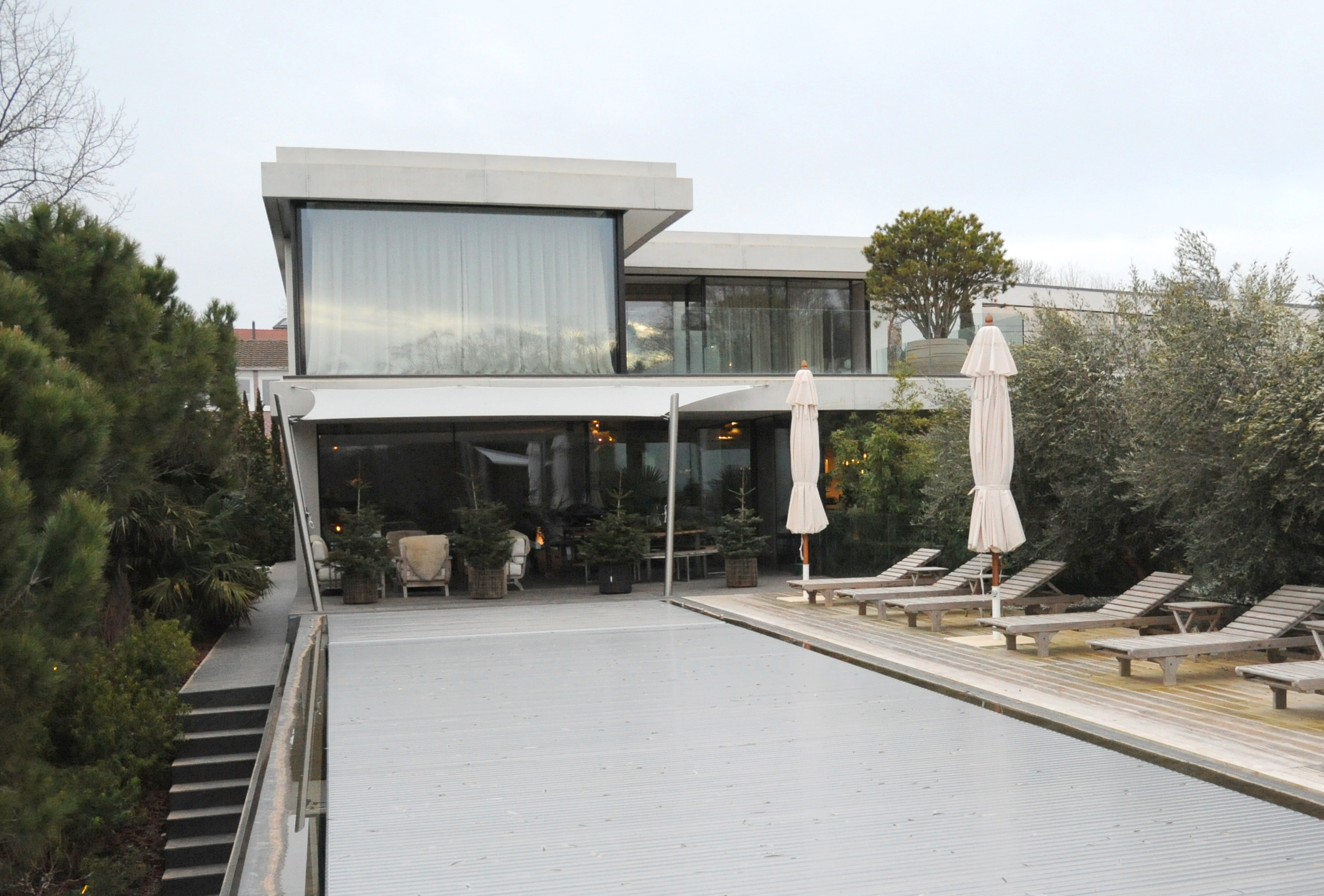 keep all existing elements in place do not modify any plants or landscaping remove the small pine trees on the terrace open the infinity pool remove any cover if present and ensure the water is clean calm and physically accurate with natural reflections and no distortion elegantly furnish and stage the terrace with a refined and balanced composition using realistic high quality materials such as natural stone wood and fabric creating a sophisticated yet understated atmosphere open all parasols with natural fabric behavior and realistic light interaction create a bright sunny sky with natural daylight soft shadows and accurate color balance achieve an ultra photorealistic architectural rendering precise global illumination realistic reflections subtle imperfections detailed textures correct perspective natural depth of field and no artificial or cgi like appearance