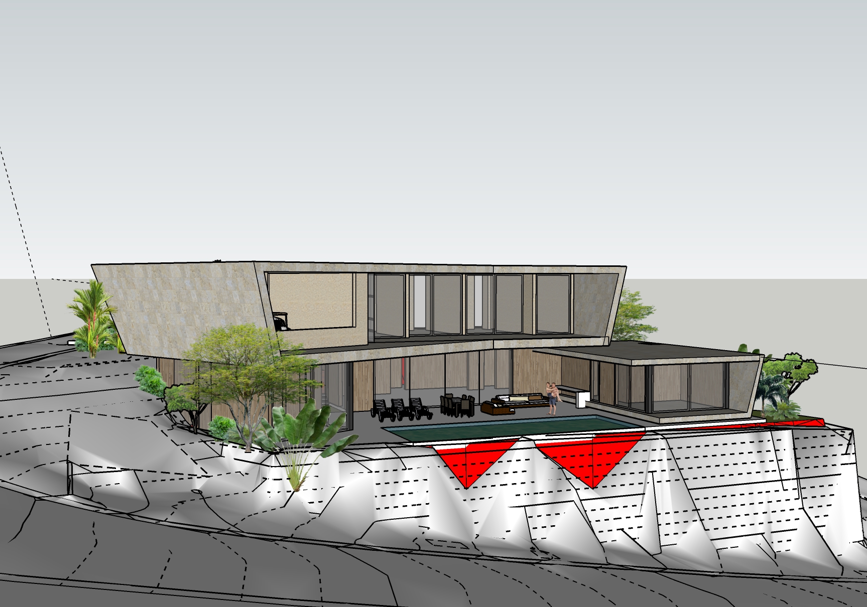 sustainable design exterior shot late afternoon exterior render with interior lights on lush vegetation and tropical mountains in background architecture