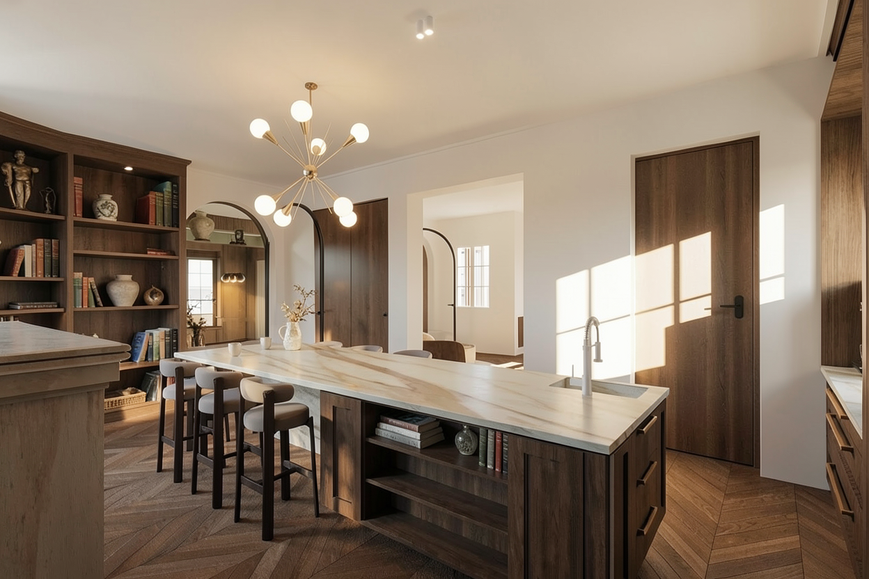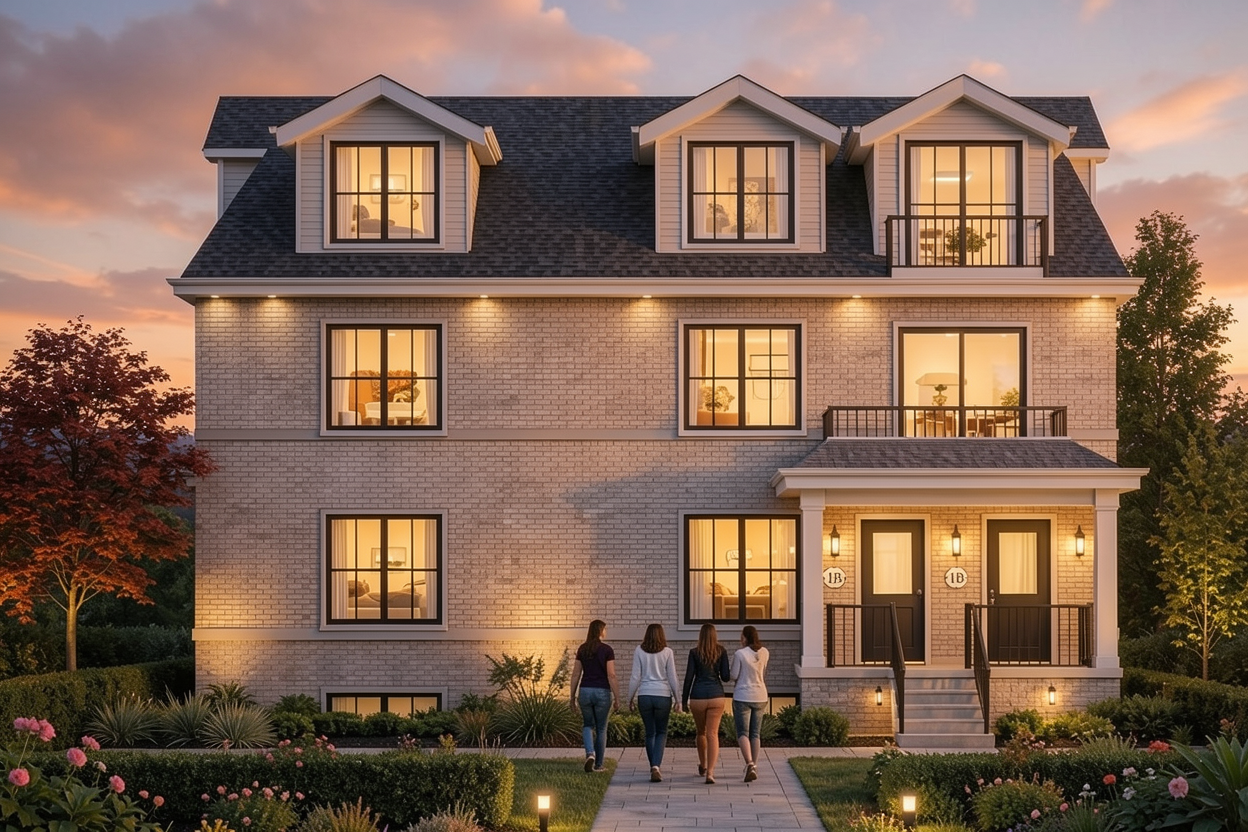 the residential building is surrounded by a lot of trees bushes and flowers in the garden