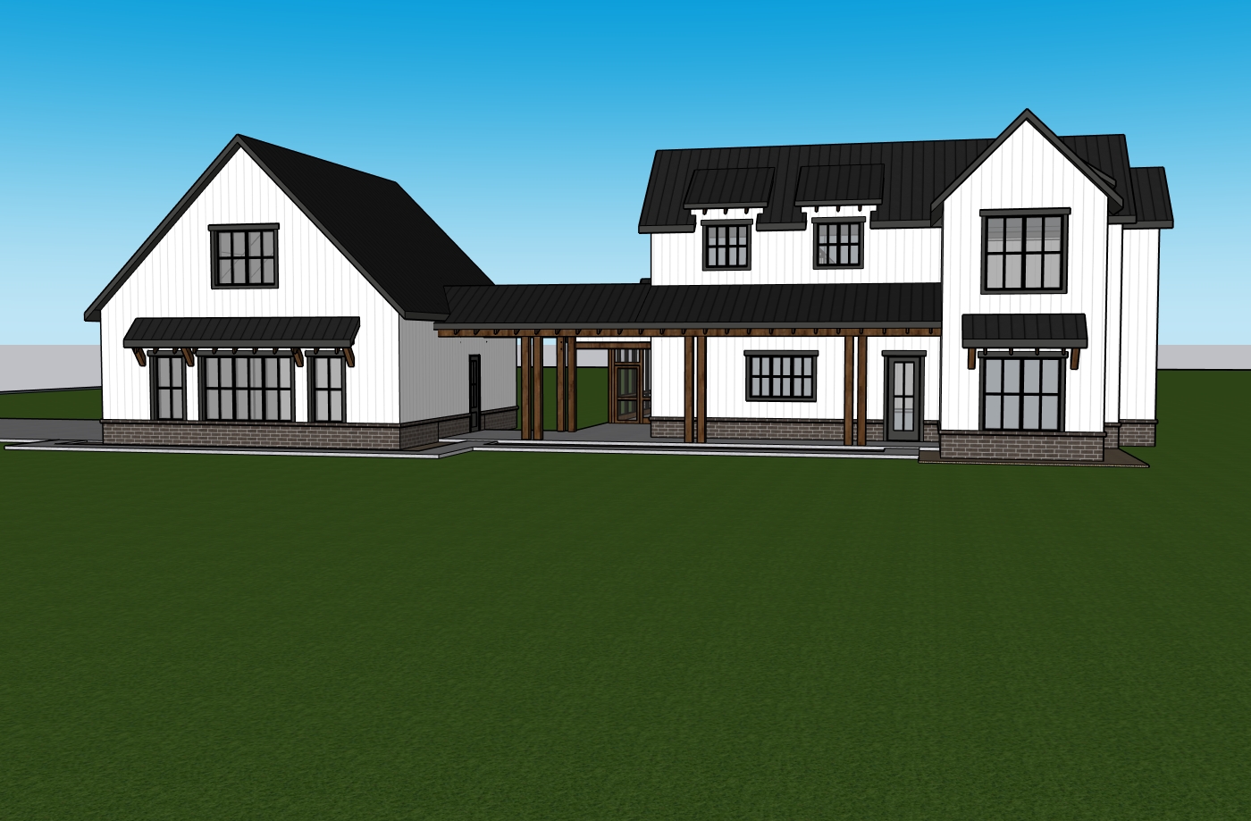 grainy watercolor render of frame building with white siding watercolor trees and country farm environment barn and windmill in the background extensive watercolor cottage style landscaping surrounding the building