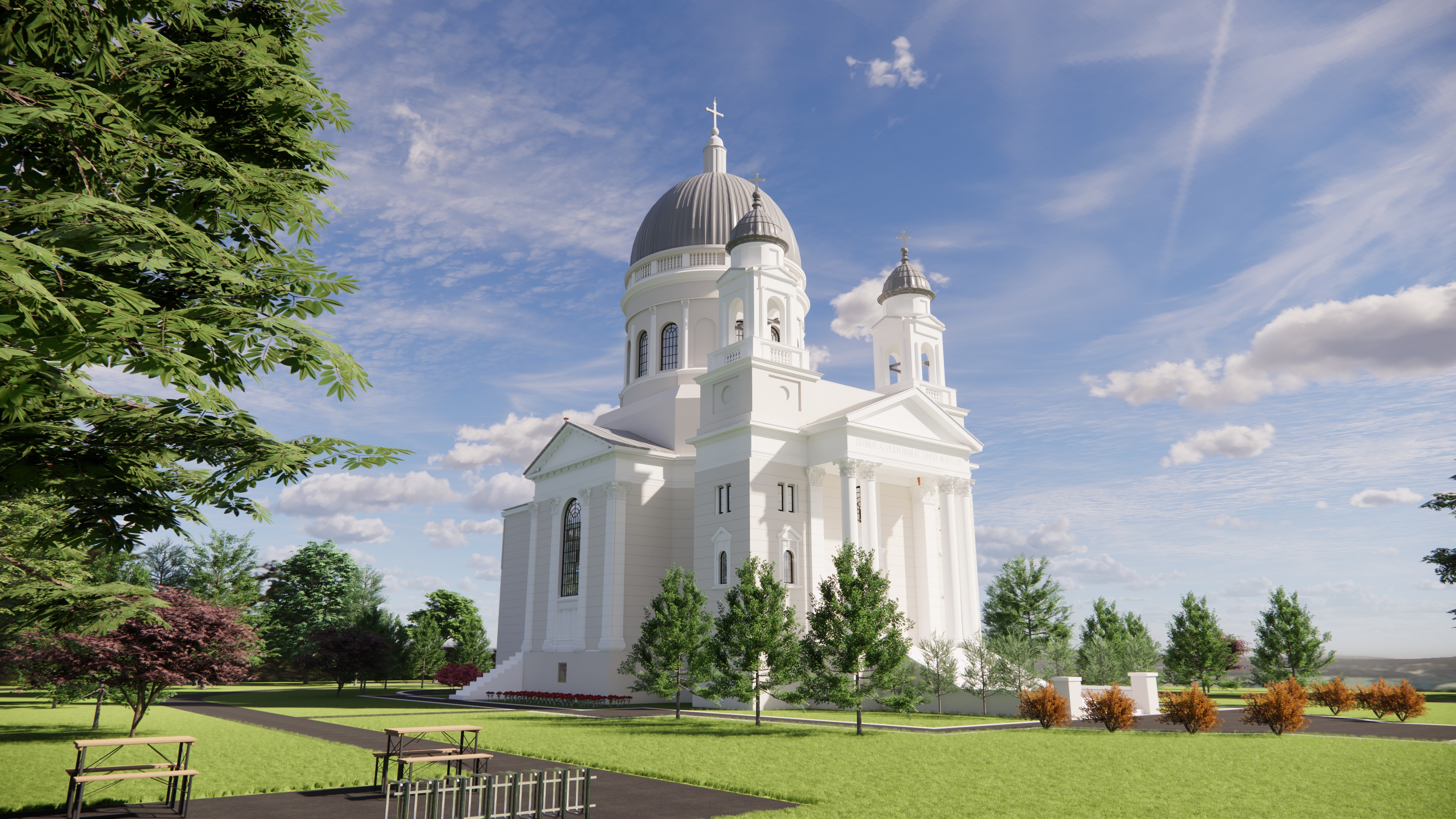 wide angle exterior architectural visualization of project description midday neutral cool natural daylight no artificial lighting visible balanced exposure medium low saturation controlled contrast corporate architectural photography style no cinematic effects no dramatic sky no warm tones clear pale blue sky with minimal soft clouds vegetation in muted olive green tones low vibrancy landscaping engineered and maintained environment clean materials without wear clear material differentiation architectural mass reads before texture subtle structural emphasis systemic spatial clarity investor oriented tone subtle emotional trigger of stability and competence ultra realistic high resolution professional architectural documentation style no sunset lighting no golden hour no warm color cast no cinematic atmosphere no dramatic fog no lens flare no oversaturated colors no lifestyle staging no artistic grain no excessive depth of field blur