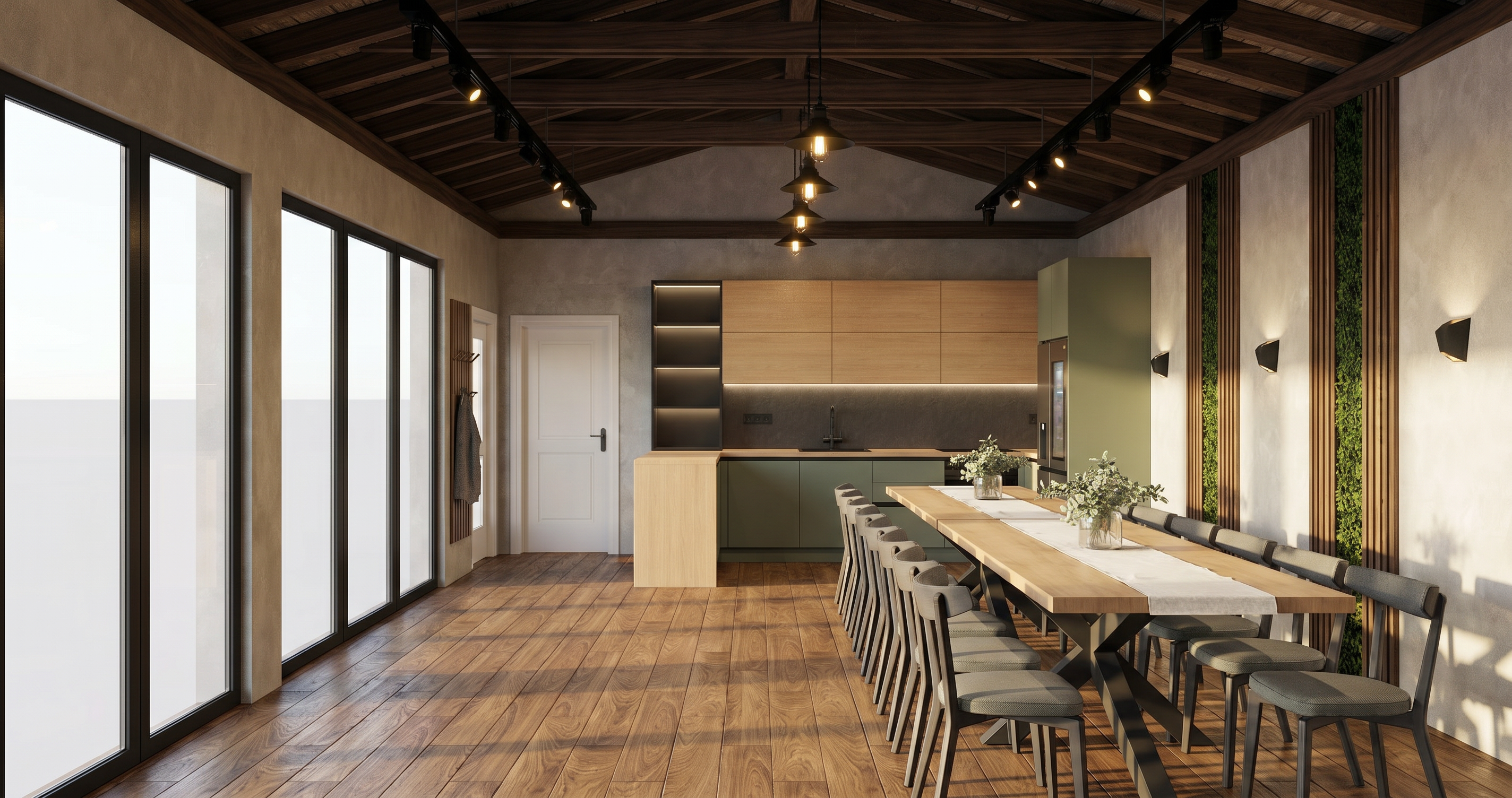 i want a photorealistic image of this render nothing may be changed about the content the floor is a gray tiled floor on the right is a large window through which natural sunlight must come the view from the window is a green garden with trees and organic green areas the garden is a minor detail in the render so it does not need to be very prominently visible preferably a slightly blurry visible garden the shelves have an led strip with lighting on the top and bottom the shelves are finished in a beige stucco technique