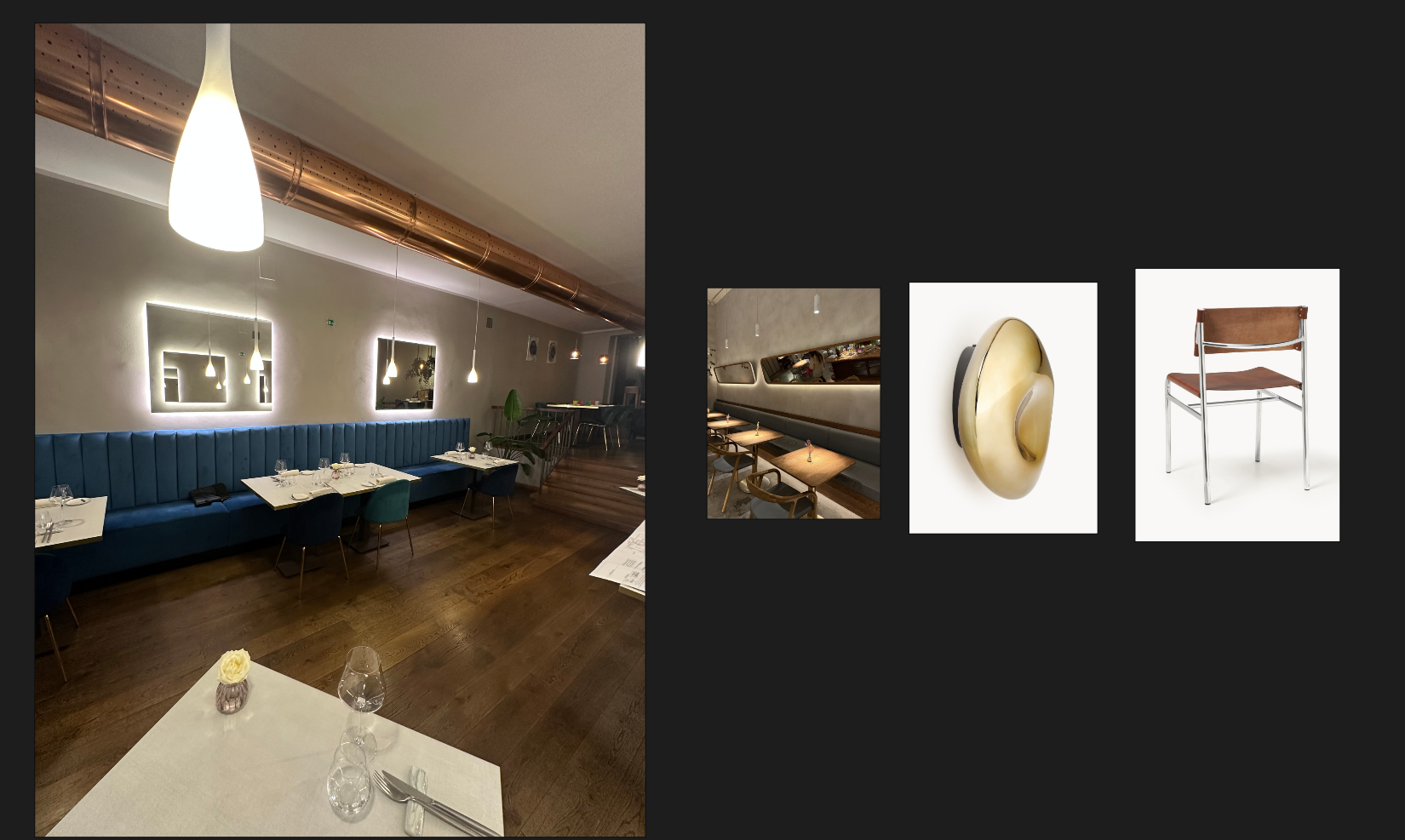 space camera architecture locked use the first reference image strictly as spatial and camera reference maintain exactly the same room proportions layout depth scale ceiling height stairs railings and camera position do not alter the architecture do not widen or heighten the space do not introduce new openings or structural elements fixed elements must remain identical banquette sofa maintain the existing long continuous blue banquette sofa running along the wall exactly as in the reference image do not change its length position height color or upholstery do not replace it with chairs or separate seating the banquette must remain continuous and integrated along the wall dining tables maintain all dining tables exactly in the same position as shown in the reference image do not change table layout spacing alignment or quantity the number of tables and the number of seats must remain identical do not remove tables do not add tables do not shift their position floor maintain the exact same floor as in the reference image same material color texture finish and level of reflectivity preserve all natural reflections and light response on the floor ceiling duct maintain the existing exposed metal duct running along the ceiling exactly as shown in the reference image same position size material and finish do not remove it replace it or redesign it table styling allowed change upgrade the table styling with an elegant and refined mise en place high quality tableware refined plates delicate glassware elegant cutlery subtle textile elements the composition must be minimal sophisticated and uncluttered creating a calm yet luxurious fine dining atmosphere everything feels curated balanced and intentional walls mood reference 2 no boiserie use the second reference image only for wall design and surface treatment do not change wall positions or room dimensions walls are finished in continuous warm plaster soft textured surfaces with subtle tonal variations no paneling no boiserie no decorative frames the atmosphere is intimate refined and contemporary mirrors reference 2 along the wall place exactly three inclined mirrors using the second reference image as exact object reference mirrors must have same shape proportions and inclination angle same rounded corners same horizontal orientation same material and finish mirrors must be integrated flush into the plaster wall surface no reinterpretation the room length is 7 20 meters distribute the three mirrors evenly along the wall wall sconces reference 3 between each mirror place wall mounted sconces using the third reference image as exact lighting reference same shape size material and light temperature sconces must be positioned centrally between mirrors creating a regular and balanced rhythm along the wall ceiling pendants reference 2 along the mirror wall maintain exactly four ceiling mounted pendant lights in the same positions shown in the reference image do not change their location spacing or height replace only the lighting fixture model using the second reference image as exact object reference same pendant design proportions material finish and warm light temperature chairs at tables reference 4 replace the existing blue chairs at the dining tables with the exact chairs shown in the fourth reference image use the fourth reference image as exact object reference same chair design proportions materials color finish and leg structure maintain the same number of chairs per table and the exact same seating positions do not change table size spacing or layout the chairs must feel elegant refined and coherent with a high end dining atmosphere final render quality long narrow restaurant interior with a central axis and shallow steps symmetrical seating arrangement intimate fine dining atmosphere ultra photorealistic architectural visualization professional interior photography straight vertical lines 24 26mm lens