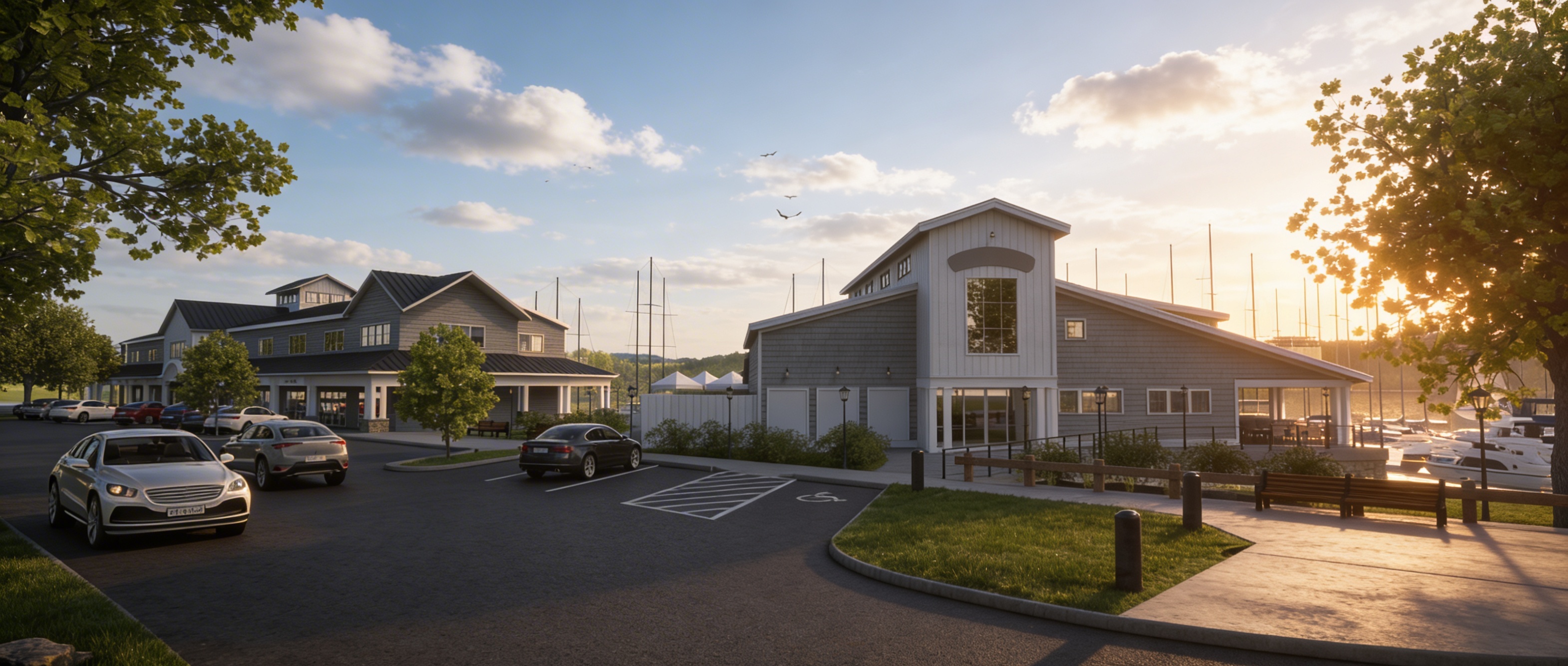this is an image of a new clubhouse being built for a marina in southern ct this project is clad in synthetic grey shingles with a dark metal standing seam roof the center of the building is clad in vertical white clapboard the sky should be clear with some fluffy clouds and the lighting should reflect late afternoon with a sun just starting to set the grass is short and well maintained and the sidewalk is brushed concrete the face of the building should be well lit