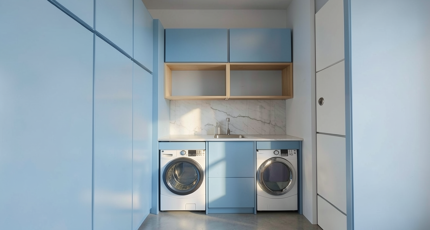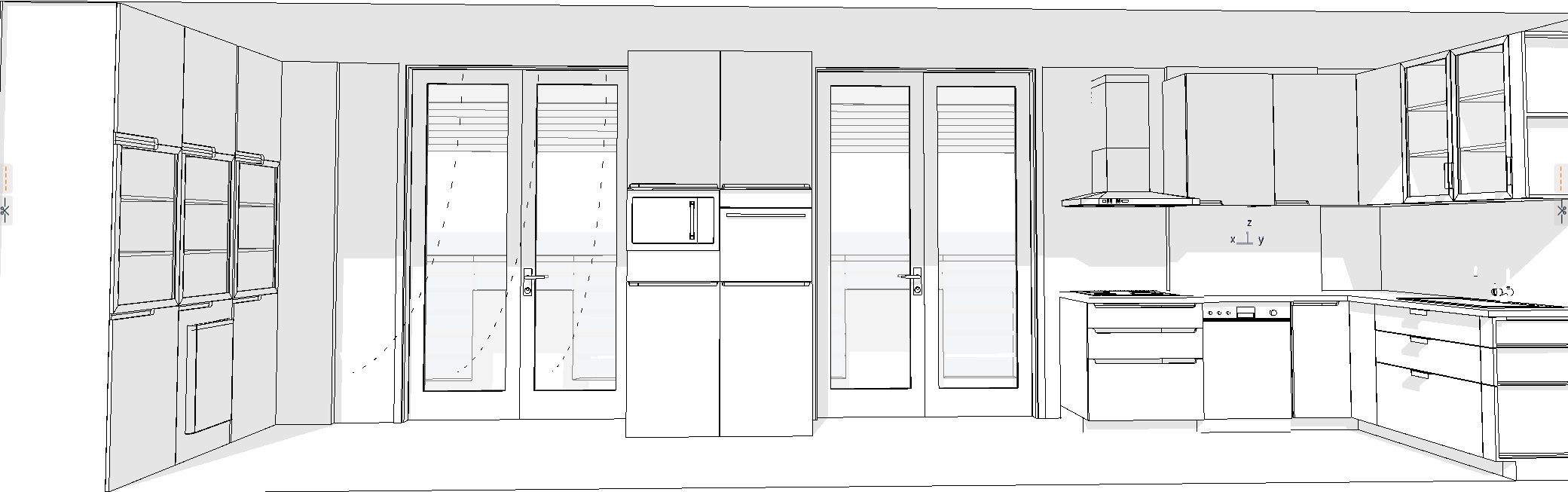 a modern luxurious kitchen with a serene and sophisticated atmosphere the room features sleek grey oak cabinetry with flutted travertine curved cabinets and a large island centerpiece made natural traavertine romano the walls are clad in a soft cashmere hue with panelling complementing the cabinetry appliances are seamlessly integrated adding a touch of contrast overhead lighting is warm and ambient creating a cozy yet refined ambiance the flooring is parquet enhancing the airy feel of the space sparse greenery adds a hint of freshness while maintaining the minimalistic and clean design outdoor light from the right hand side window view is of luxury villa style