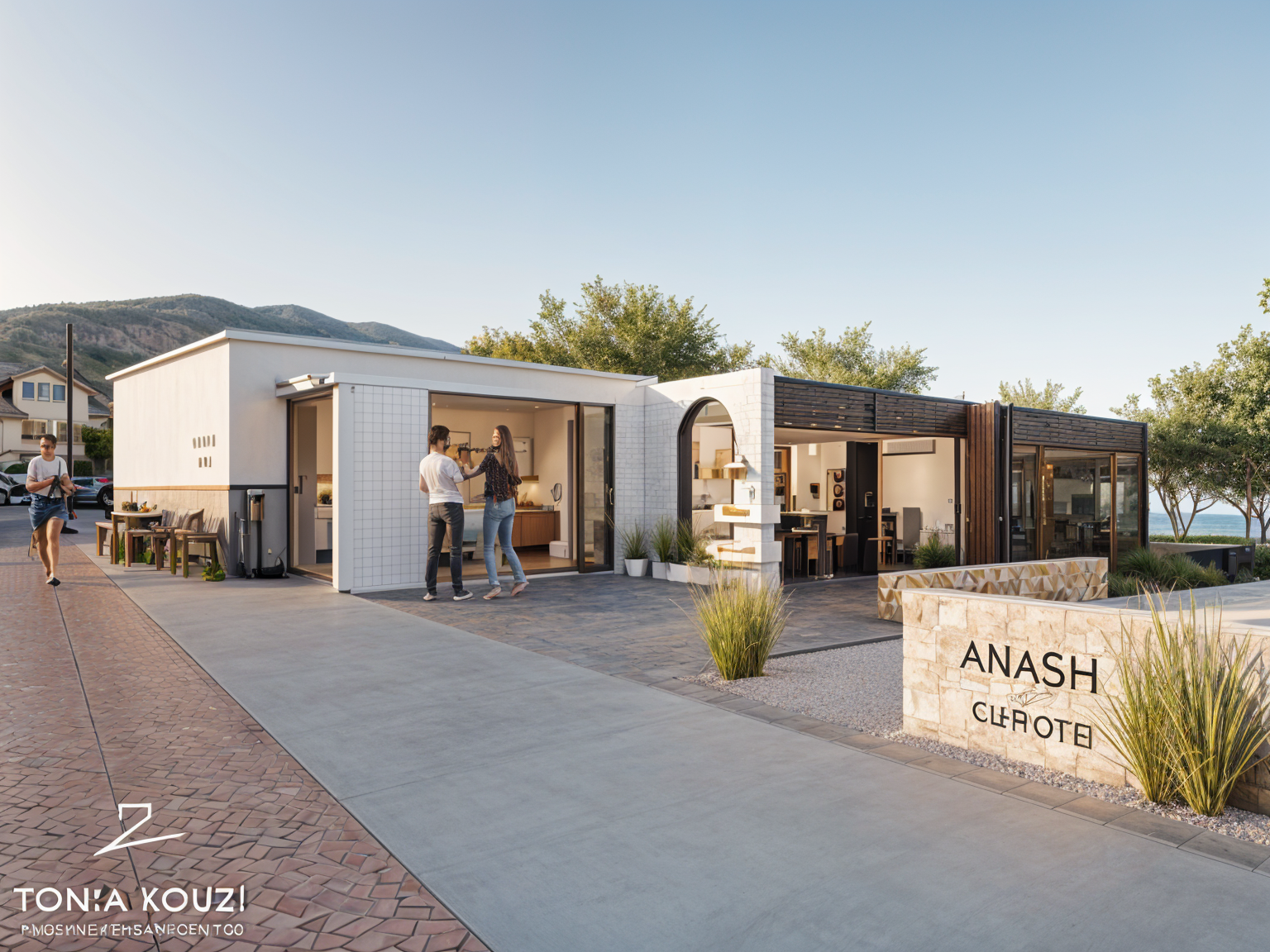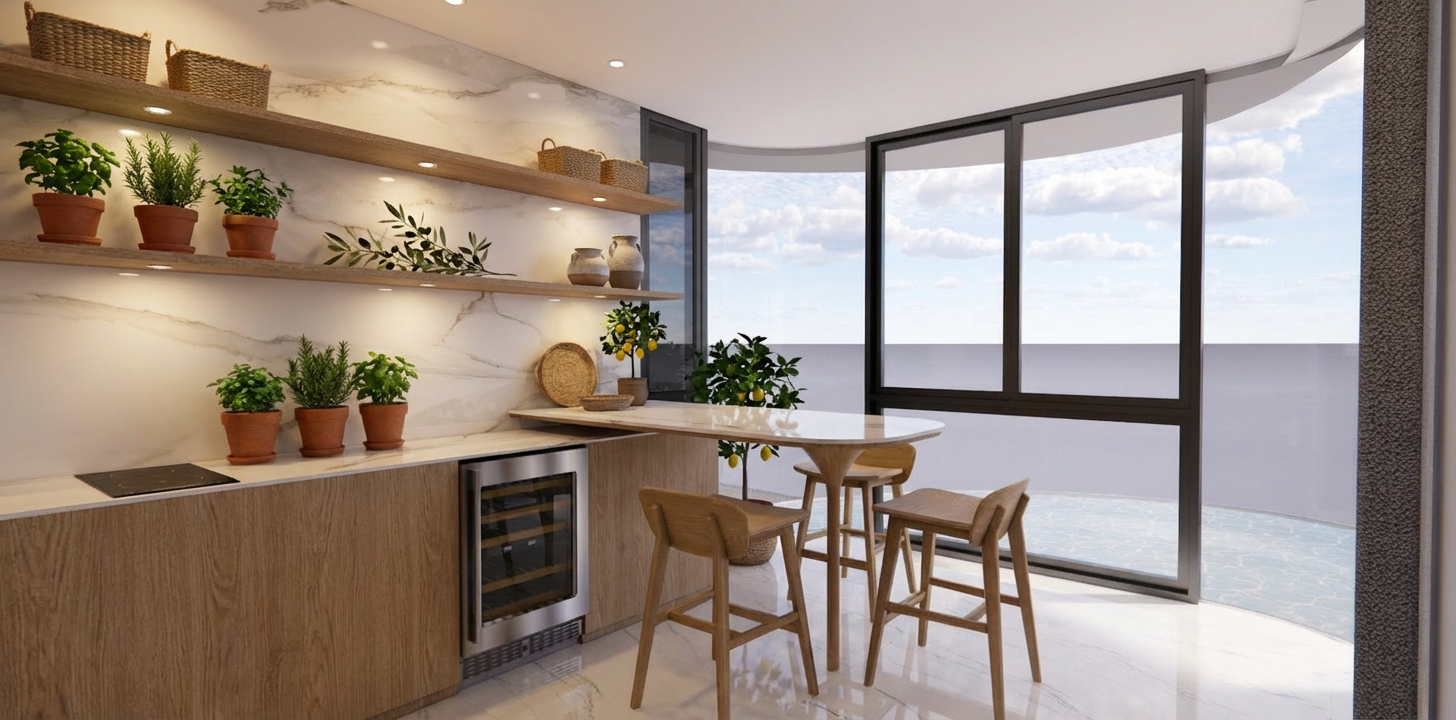 modern narrow kitchen interior realistic proportions angled perspective along the countertop clean minimalist composition with integrated storage left side continuous kitchen run with lower and upper cabinets integrated round sink and built in cooktop backsplash in light marble or stone soft neutral tones right side tall storage composition a full height glass cabinet with transparent or lightly smoked glass doors and slim dark metal frame softly illuminated inside with warm led lighting displaying shelves center a vertical built in unit containing two compact freezers stacked one above the other seamlessly integrated into the cabinetry minimal visible joints left a small walk in pantry partially open with internal shelving visible clean and functional storage space lighting soft ambient lighting under cabinet led strips along the countertop and accent lighting inside the glass cabinet to enhance depth and materials style modern minimalist highly functional with a balance between warm wood dark countertop and transparent glass elements