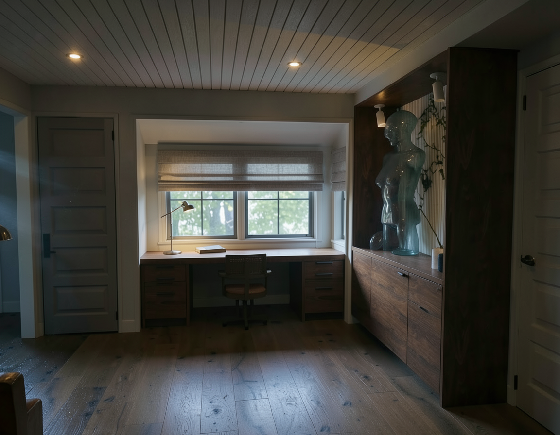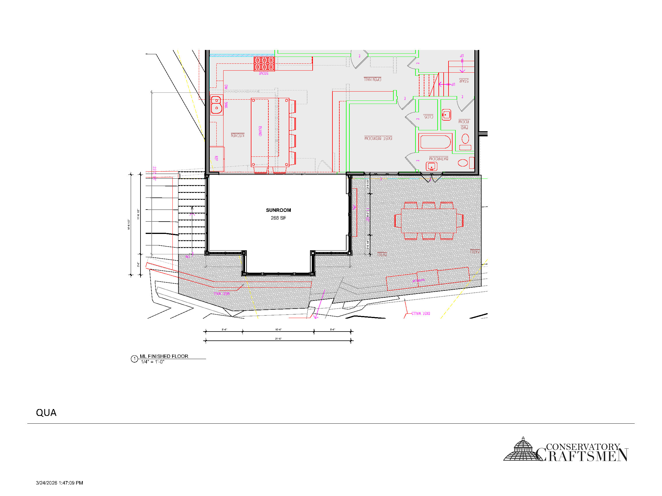 rendered kitchen plan with attached conservatory dining room surrounded by a backyard paver patio