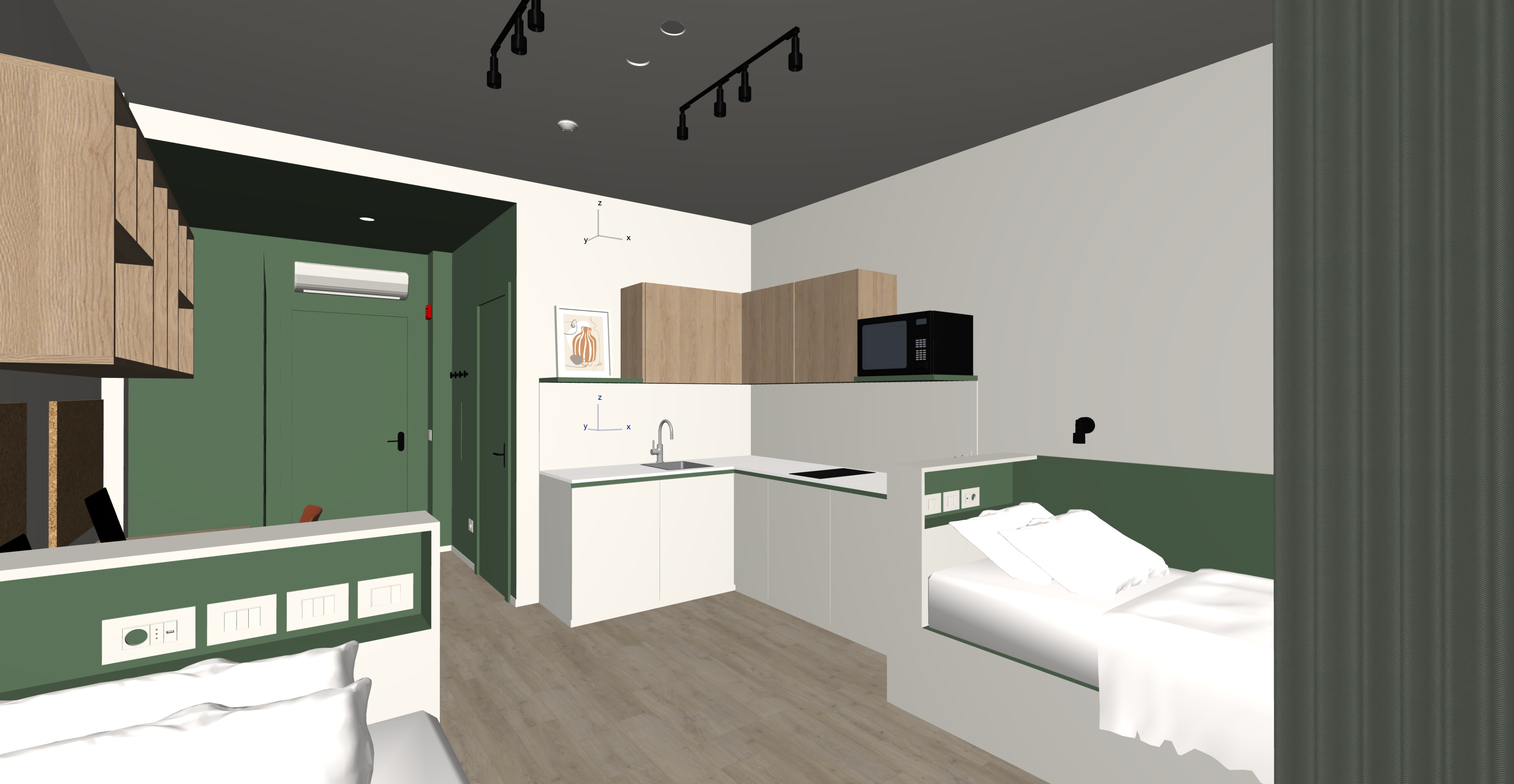 strip led sotto pensile luce leggera no poster a parete aggiungi oggetti studente universitario arreda la cucina no scolapiatti aggiungi quadro appoggiato su mensola aggiungi post it appesi al sughero le basi della cucina sono bianche rubinetto e lavello sono cromo lucido soffitto grigio chiaro accendi faretto nero a parete parquet rovere chiaro