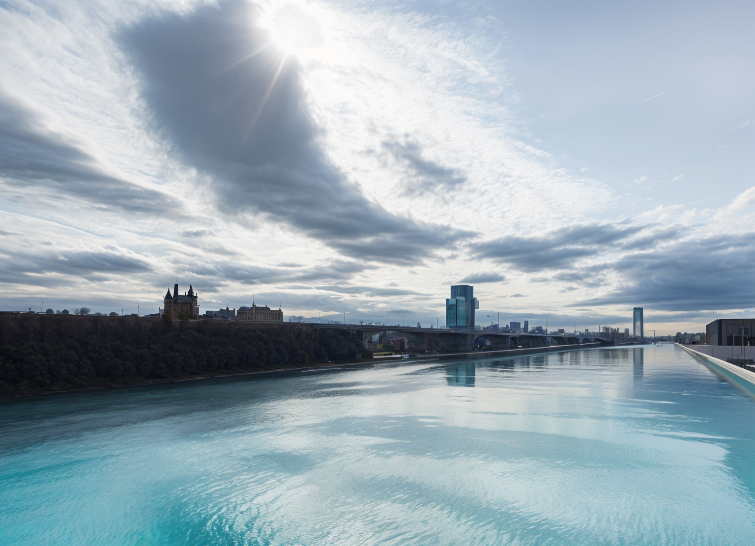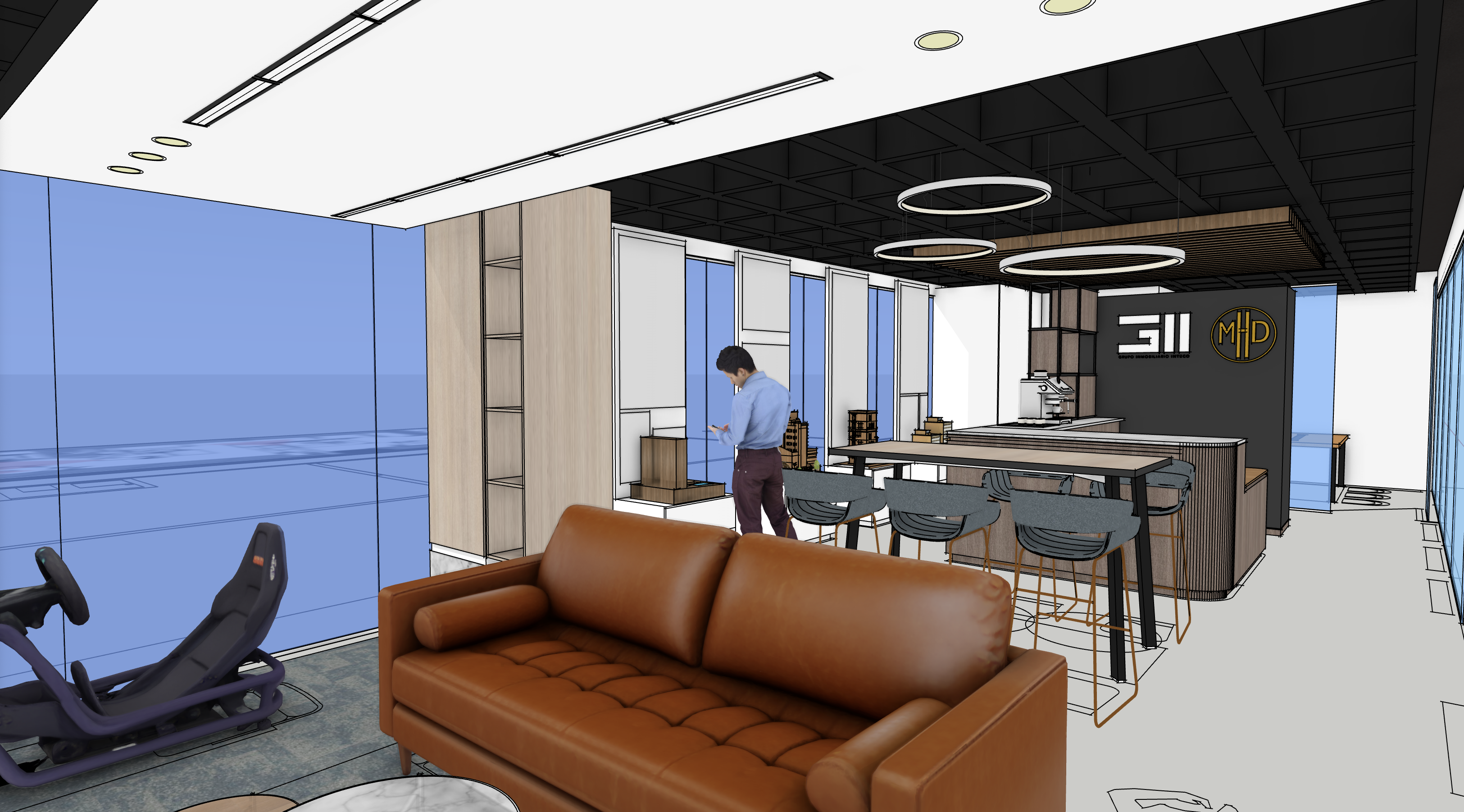 interior shot a modern office interior featuring sleek design elements the main focal point is a rich brown leather sofa adding warmth to the space incorporate large glass windows with a calming sky blue tint allowing natural light to flood the room the walls are a soft neutral white providing a clean backdrop the ceiling has a sophisticated black grid pattern with stylish circular light fixtures casting a warm ambient glow the bar area includes dark wood accents with contemporary black and grey bar stools add subtle decorative elements in muted earth tones to enhance the overall modern and professional atmosphere architecture