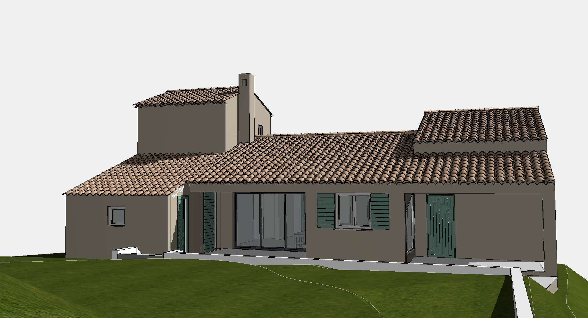 villa dans le sud de la france facade en enduit la chaux frotass fin teinte beige terre volets sont en bois lames horizontales teinte ral 7033 gris vert ne pas ajouter de fenetres ou de volets suppl mentaires