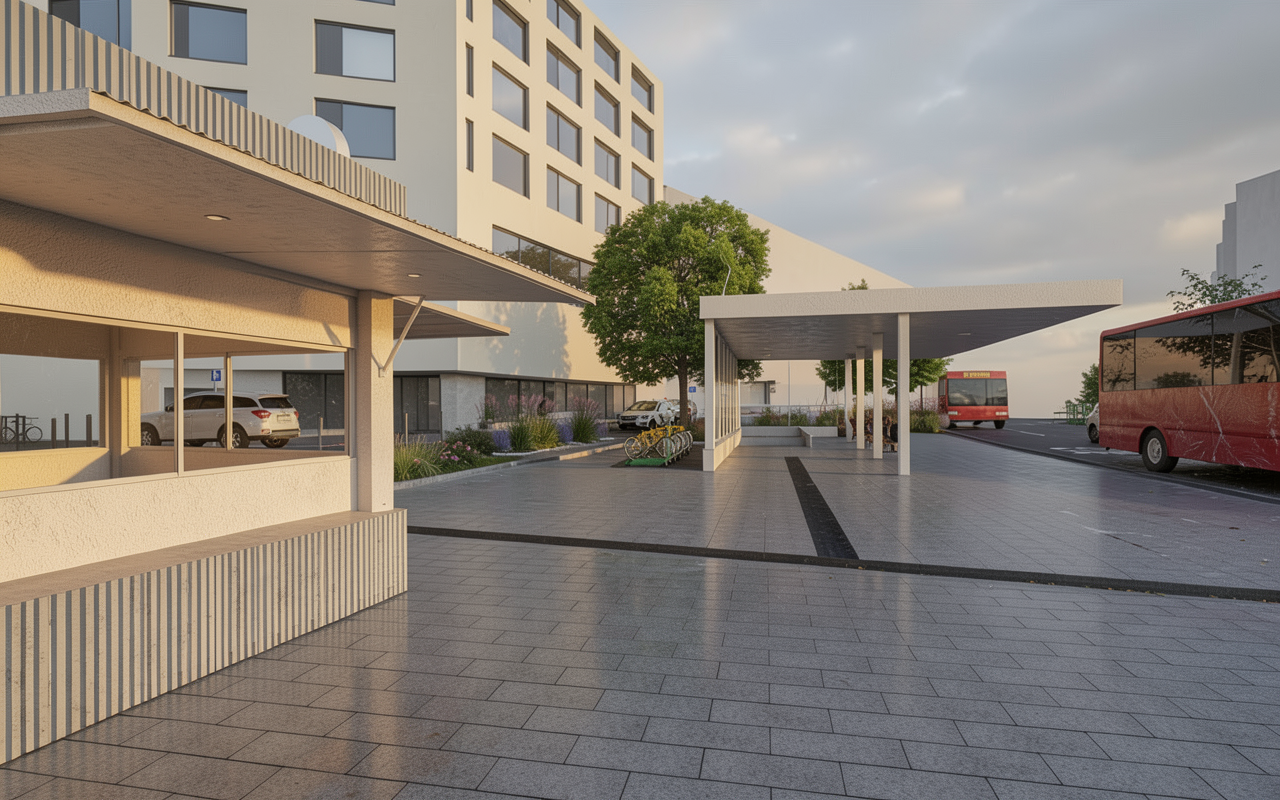 fammi una vista al tramonto elegante con luci nel vialetto d ngresso e che illuminano in maniera soffusa l edificio dal basso verso l alto