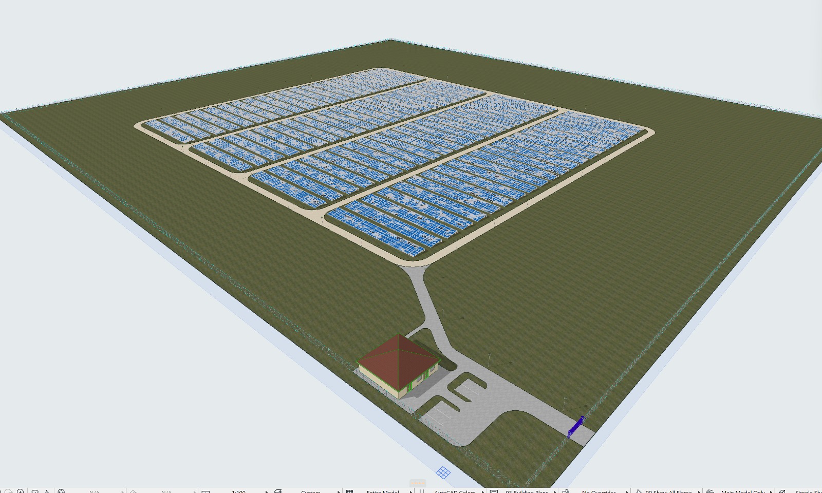 render this photovoltaik plant with few tropical trees outside the fences