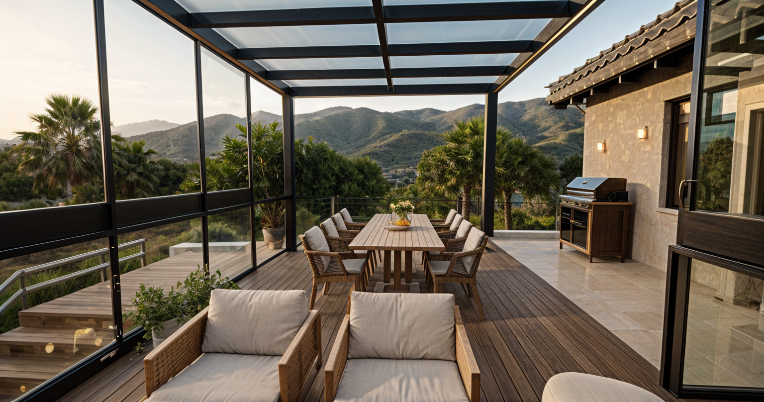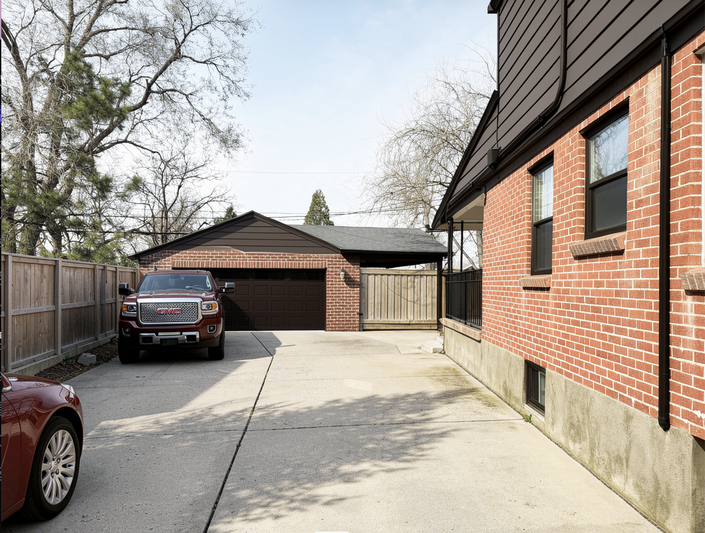 use this rendered image as the base do not change driveway roof trees camera angle house brick on main house apply the following corrections brick on garage walls the left and right vertical sides of the garage must match the exact same red brick as the main house do not paint these areas garage side walls should be brick not siding garage door paint garage door a deep dark brown very dark espresso brown almost black brown matte finish no red tone garage gable siding upper triangular section only color should be dark brown taupe neutral brown gray no red undertone no orange deep muted tone gutters and downspouts change to dark bronze black near black brown matte finish no red window frames match gutters dark bronze black no red fence change fence to warm smoky alder brown soft natural wood tone muted brown with slight gray undertone no red no orange cedar concrete foundation footing side of house paint the exposed concrete foundation along the side of the house to visually blend with the brick above it color direction warm brick coordinated taupe muted clay beige undertone soft warm gray brown that complements the brick not pink not red not cool gray important eliminate all red undertones from painted surfaces all painted surfaces should lean brown black or taupe brown no rust colors photorealistic daylight