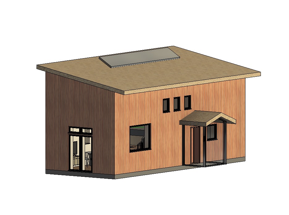 nordic exterior shot a modern tiny house with wooden exterior cladding and a green growing roof with solar panels terrace outside located in an eco village with children playing outside architecture