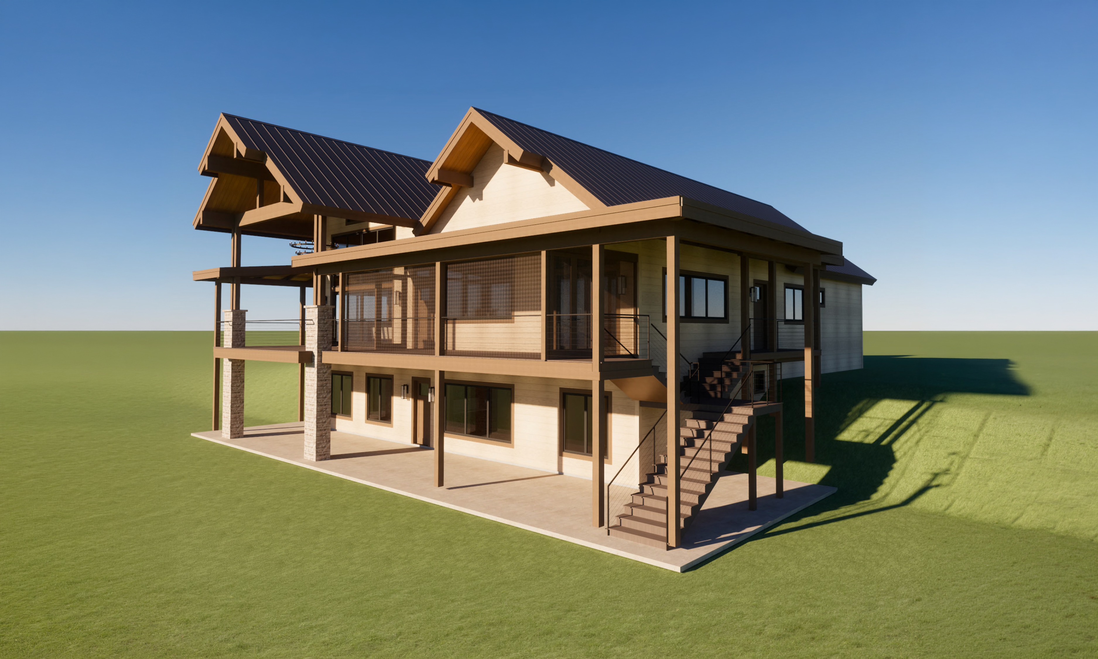 back view of a clean modern architectural exterior rendered in cinematic vibrant sunset lighting modern architectural style modern siding beautifully lush green manicured landscape around structure black standing seam metal roof prominent cinematic lake reflections off of the windows of the house dock on the water in front of the house streaks of light shining through trees surrounding house high fidelity photorealistic visualization crisp shadow falloff refined facade geometry soft atmospheric depth premium architectural photography mood ultra clean composition and materials dark trim around windows warm glow through the windows of the house