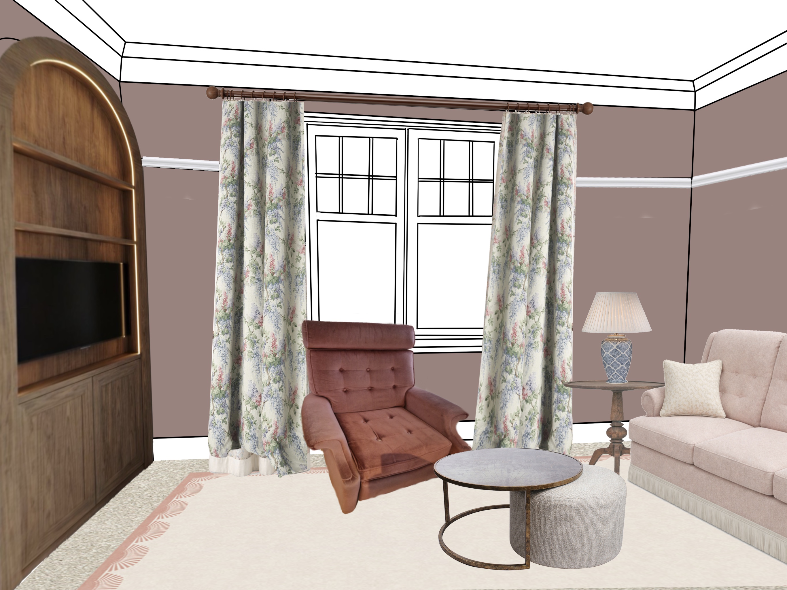 cornice is standard not ornate sofa is romo fabrics olavi in wild rose and the cushions are villa nova fabrics zetta in birch the wall colours are sulking room pink by farrow and ball and the skirting cornice and picture frame are in all white by farrow and ball keep curtain fabric exactly this pattern this is linwood fabrics the english garden vita in pink and blue add some books onto the shelving above the tv led lighting following the arch along the bookcases curve keep the rug exactly how it is in regards to the border pattern