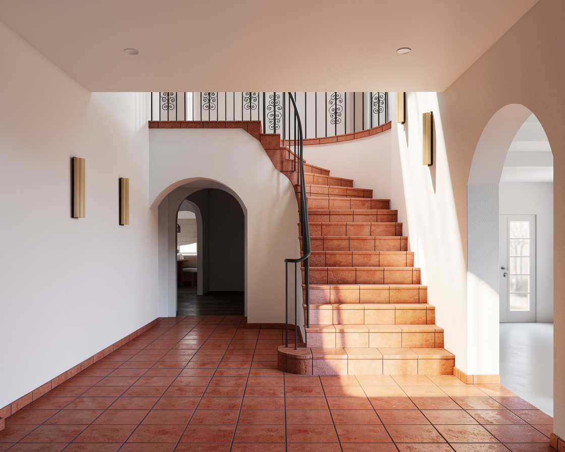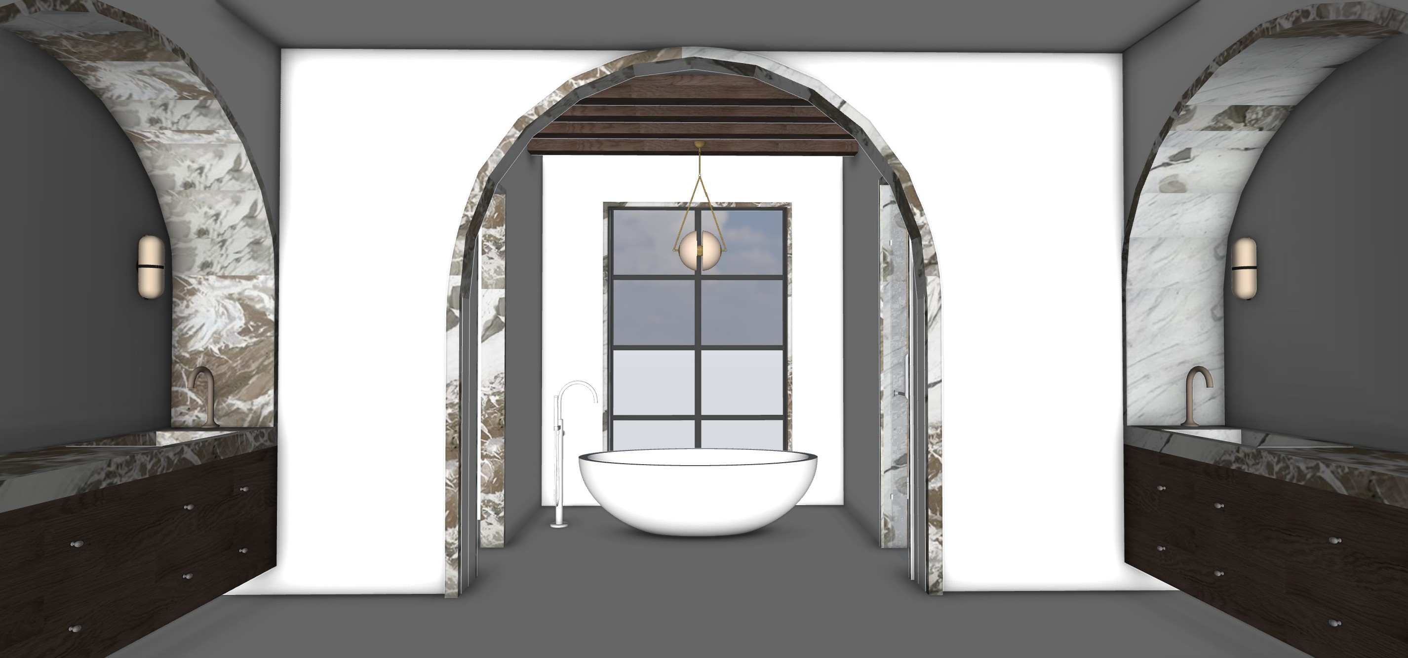 create photorealistic rendering of this single story master bathroom add ceiling mount linen drapery stacked right of window remove stone surround on arches window and doorways add creme limestone vintage tumbled 16 x 24 flooring finishes of faucets are matte dark bronze add arched mirror behind vanities add soji white plaster finish to all walls and ceiling keep dark stained rustic beams over tub area change tub to waterworks candide 66 x 27 x 27 freestanding oval cast iron bathtub white cast iron interior matte antiqued silver exterior looks beautiful change sink faucets to single handle control on outside of vanity side correct the tub and tub filler to be dark bronze finish
