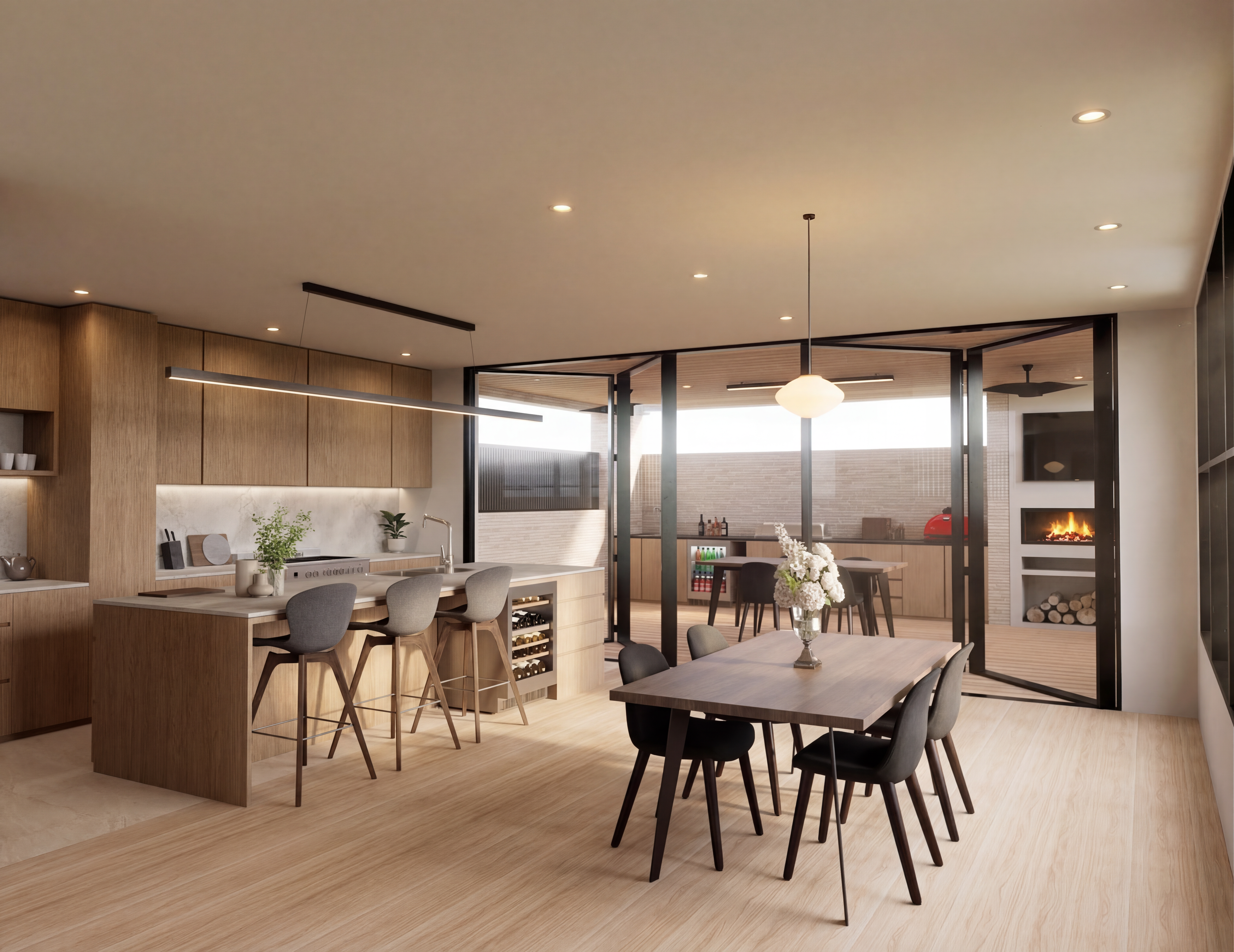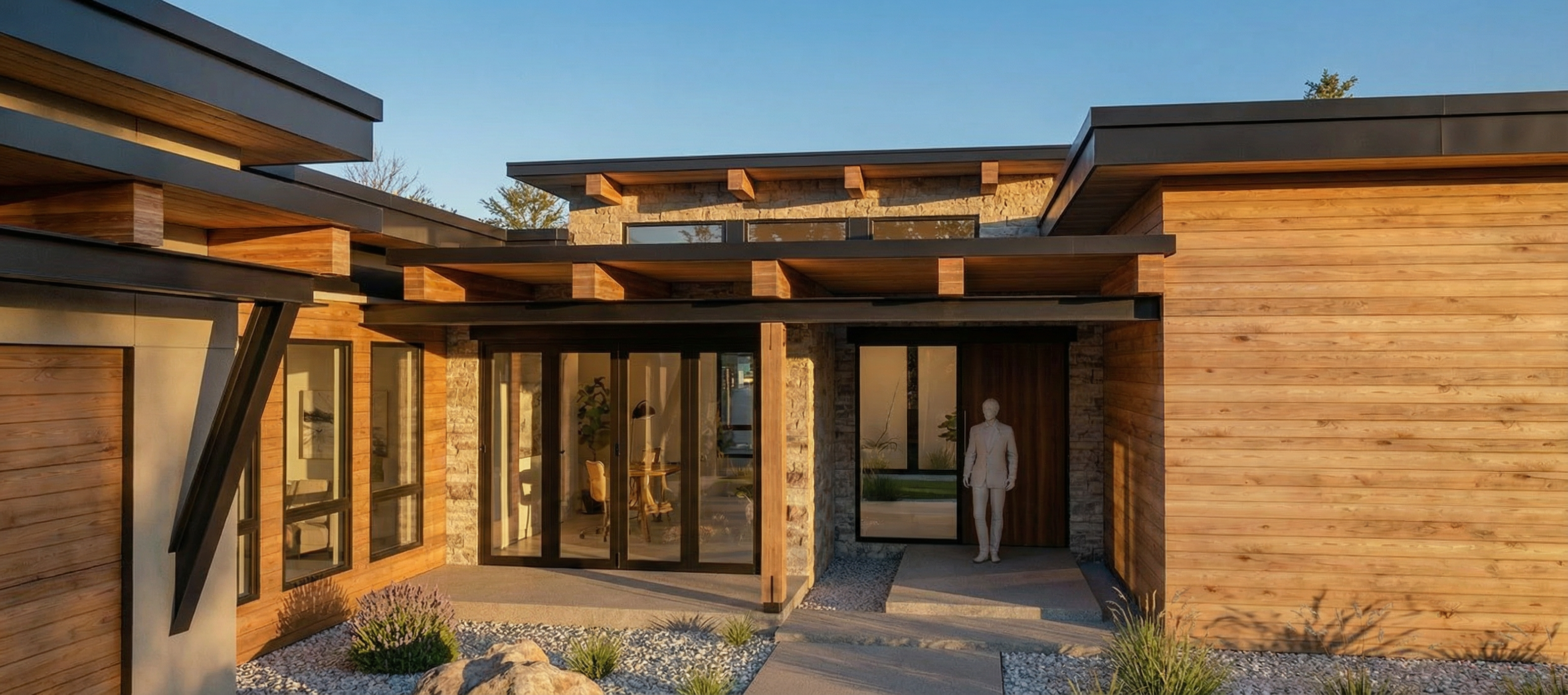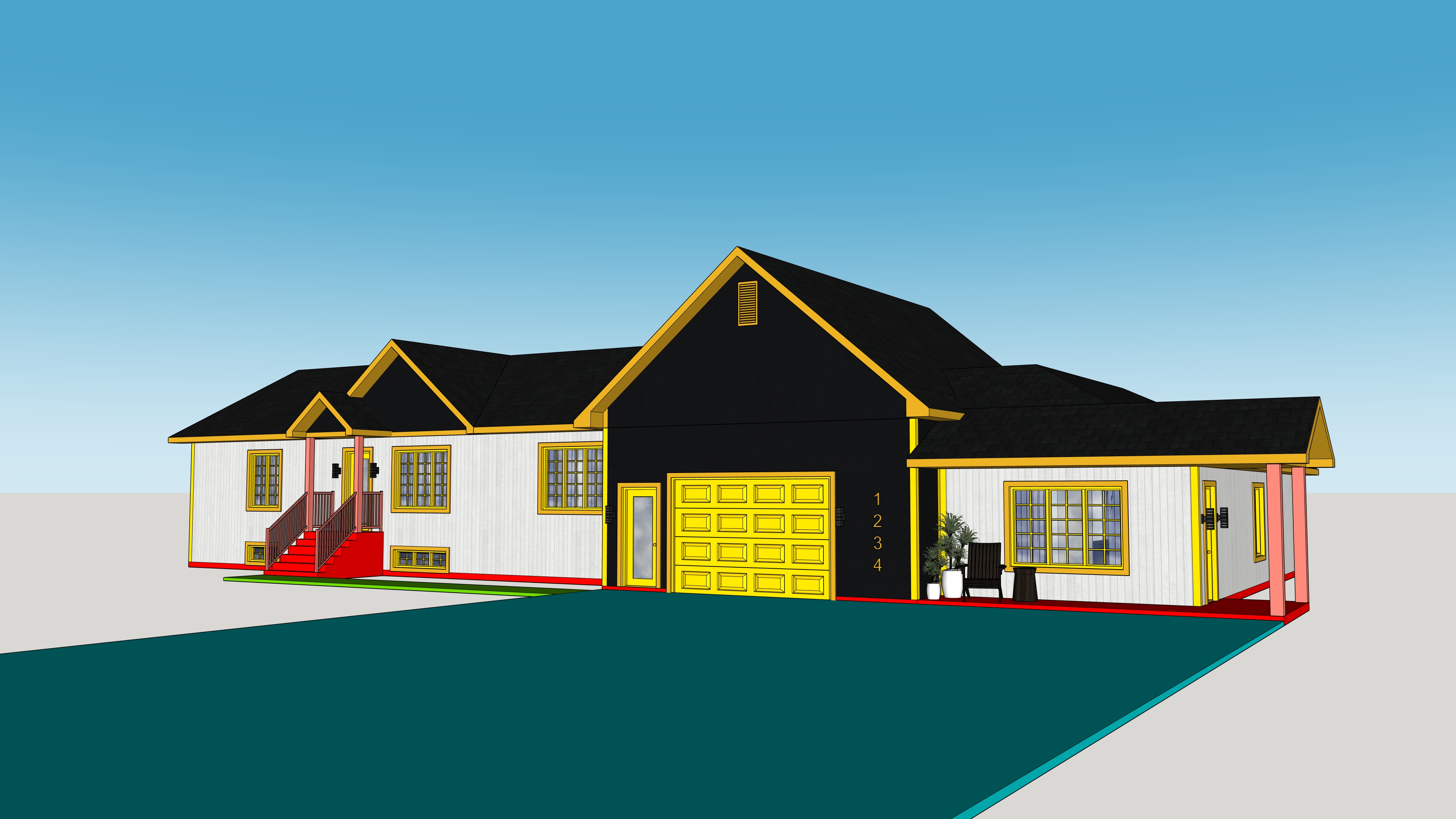 prairie style perspective shot for this farmhouse style project we are mainly using white vertical vinyl siding the window trims are black wood moldings the windows are white pvc with grilles in the glazing we also have vertical black siding on the garage section which is black wood cladding the garage door will also be black the front gables are also finished in black siding everything shown in yellow on the image should actually be black the fascia that appears yellow is in fact black aluminum and the window surrounds are black wood moldings the columns shown in pink are actually white aluminum i would like a nice landscaping design while keeping an asphalt driveway in front of the garage for the background i would like to include trees since the setting is rural i would like an after rain effect and a realistic render architecture