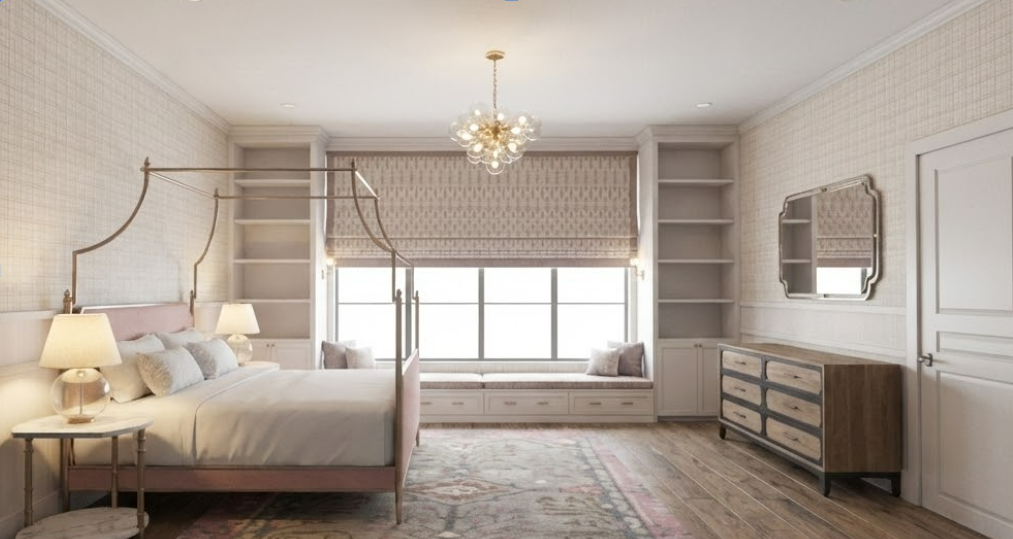 apply the same wallpaper that is currently on the room walls to the back panels of both built in bookcases on either side of the window the wallpaper should match exactly in color scale and pattern only apply wallpaper to the back panels of the shelves do not change the shelf color trim cabinets window seat bedding lighting furniture or wall color keep everything else exactly the same