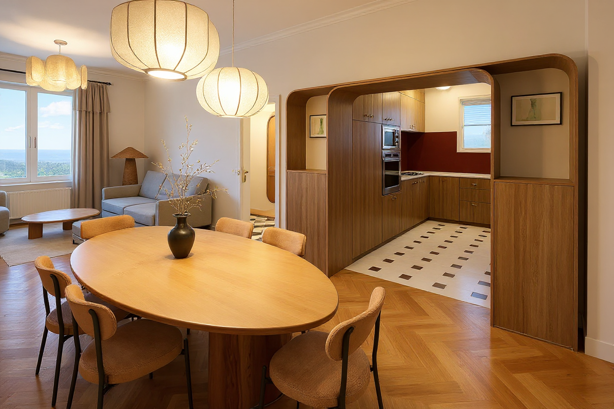 keep the colors as is dont change any material just same as the pic and the add light to the ceiling indirect and chandelier that fits the mood of the design