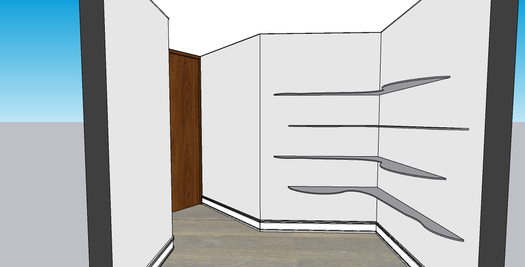 prompt for archsynth ultra realistic interior rendering of a small closed room based on the reference images the room features organic shaped corner shelves made of brushed stainless steel with a smooth metallic texture and subtle reflections the floor is composed of gray toned wooden parquet showing natural wood grain and a semi matte finish the walls are off white creating a soft and neutral contrast with the flooring the ceiling is a white plaster ceiling with recessed tabica detailing and the baseboards skirting boards are white matching the minimalist aesthetic maintain the original door design and proportions as shown in the model lighting should be artificial suitable for a closed space without windows but the room must appear bright and evenly illuminated do not include visible ceiling light fixtures or lamps the illumination should appear soft and diffused as if coming from hidden sources add decorative elements on the shelves such as ceramic and glass vases framed photos and small art objects arranged tastefully to enhance the realistic and elegant atmosphere respect the organic forms of the shelves and the shape of the room exactly as in the reference images the final render should express sophistication realism and calm minimalism with attention to texture quality material reflections and balanced lighting