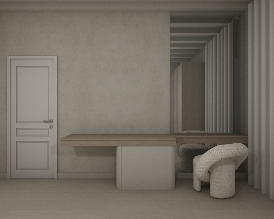 create a realistic and professional render of a bedroom with a calm and atmospheric mood the space is softly illuminated with natural daylight creating a gentle ambiance with minimal shadows the lighting should feel balanced and natural enhancing the realism of the materials without strong contrasts