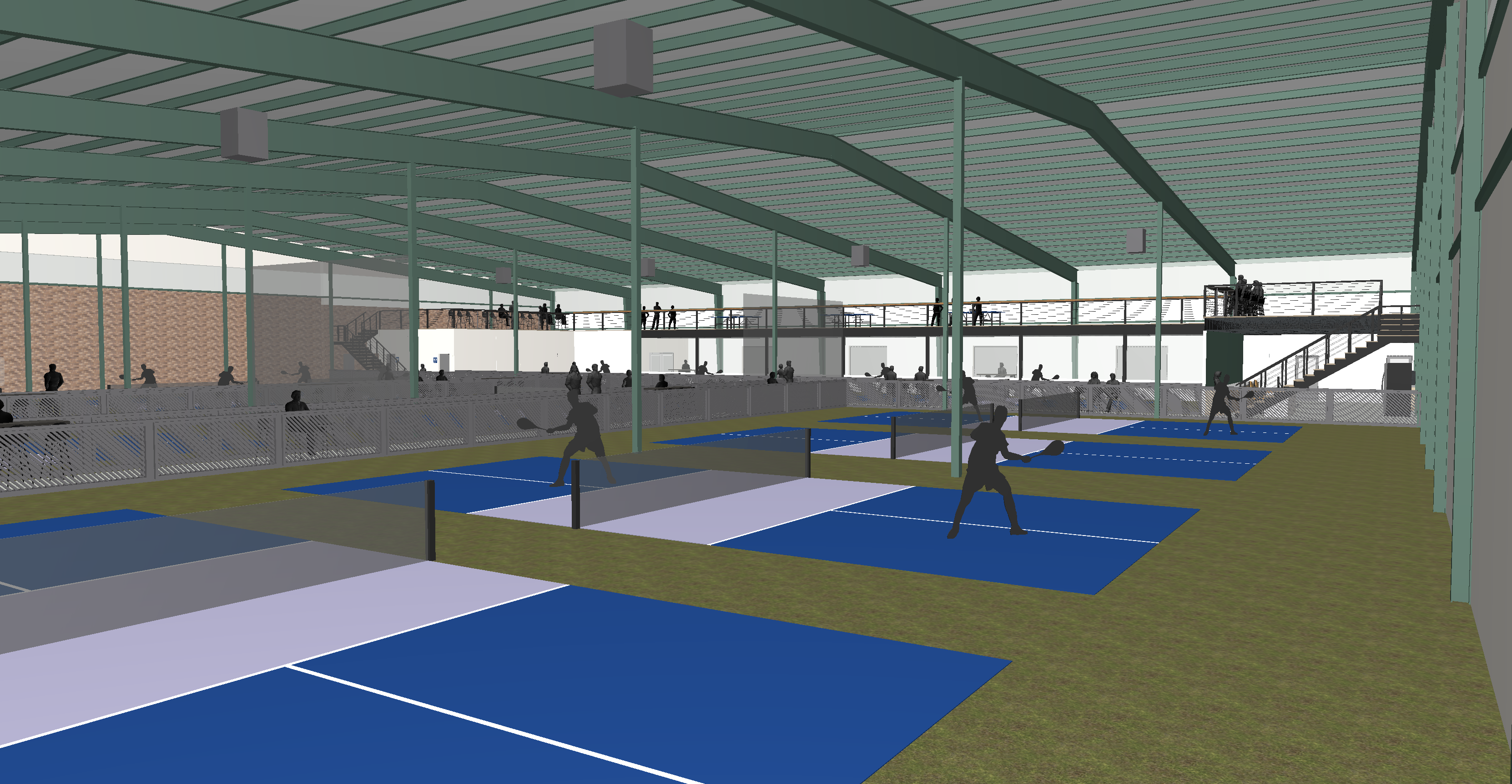photorealistic indoor pickleball facility with players and observers ambient light coming into the space through translucent upper walls maintain green color surrounding courts from source image