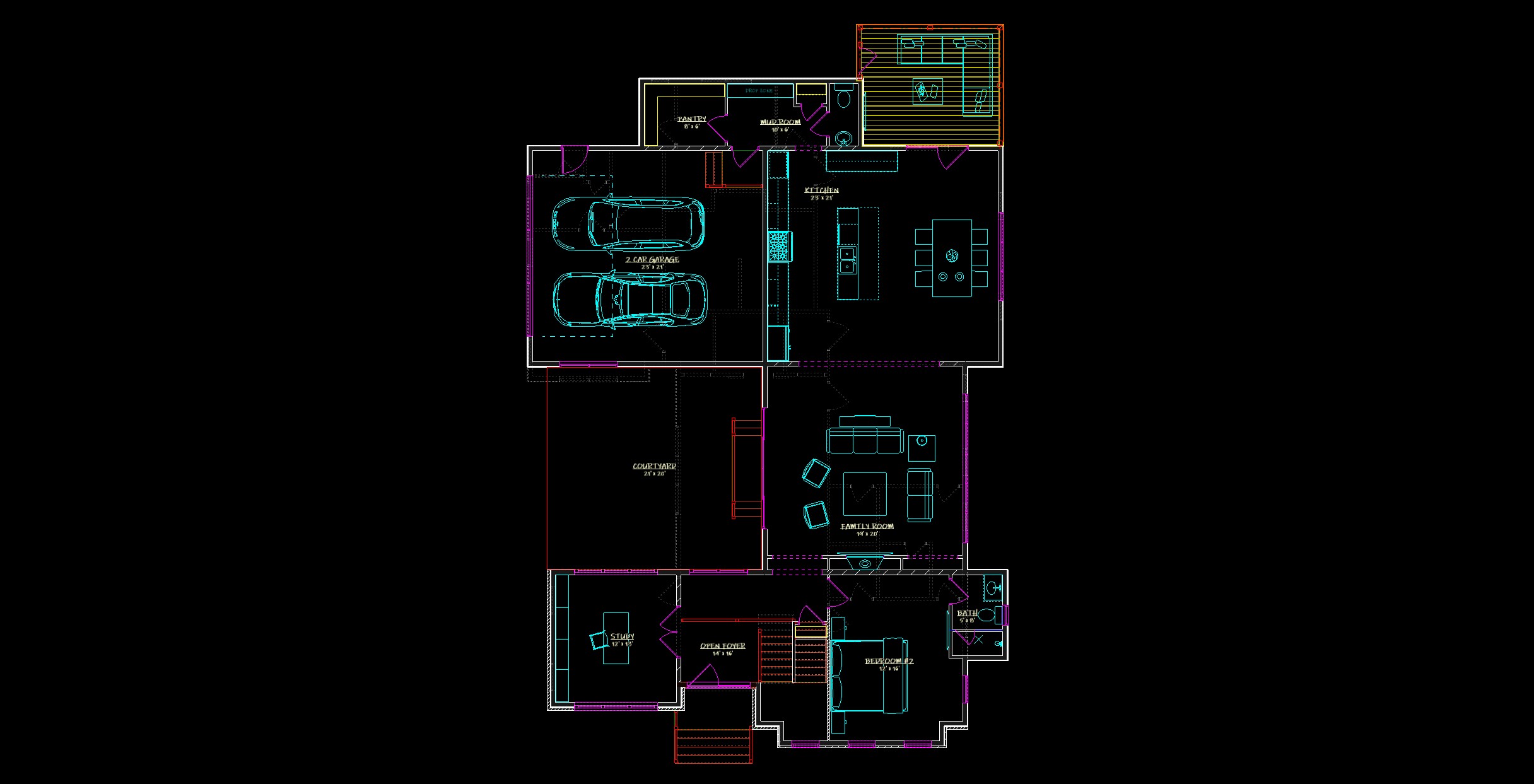 modernist interior from the top transform this 2d residential floor plan into a high end photorealistic straight down furnished architectural render primary goal create a realistic top down interior visualization from the supplied floor plan while preserving the exact architectural layout the output should look like a premium real estate marketing render with soft natural daylight realistic shadows clean materials elegant furnishings and correctly interpreted room functions critical instruction do not place furniture generically you must read and obey the room names room labels plan text symbols fixture locations appliance locations cabinetry plumbing layout and garage car orientation shown in the drawing the room label and architectural content control how each room is furnished and rendered layout accuracy preserve the exact footprint walls room shapes openings windows doors built ins stairs cabinetry plumbing fixtures and exterior boundaries from the source plan do not move walls do not swap rooms do not reinterpret the floor plan loosely do not invent alternate room purposes maintain the exact adjacency and circulation shown in the drawing keep all door swings garage openings porch deck areas and major architectural elements aligned to the source room interpretation rules interpret and furnish each room according to its room name and architectural clues if the room is labeled garage 2 car garage 3 car garage render as garage space only place vehicles inside the garage in the correct orientation relative to the garage door opening align cars so they face the garage door direction logically do not place living room or patio furniture in a garage preserve parking layout drive in direction and clearances if cars are shown in the source drawing keep their position and orientation consistent with the plan kitchen include kitchen cabinetry island counters appliances stools only where appropriate and kitchen styling do not place bedroom or living room furniture here keep the island and appliance positions aligned with the drawing family room great room living room furnish as a living space with sofa chairs coffee table rug and light decor orient furniture to fireplaces feature walls or main gathering direction if shown dining room furnish as dining only use a dining table and chairs centered appropriately in the room do not place a bed or living room seating here bedroom primary bedroom owner s suite furnish as a bedroom with correctly scaled bed nightstands rug dresser if appropriate align bed placement to logical walls and windows do not treat bedrooms like offices or living rooms study office furnish as an office with desk chair shelving and minimal seating if space allows do not place a bed unless the plan clearly indicates dual use bath powder half bath full bath keep plumbing fixtures exactly aligned to the plan use only bathroom fixtures and finishes do not place furniture unrelated to a bathroom mud room laundry pantry furnish only with appropriate utility elements cabinetry bench storage washer dryer if shown or implied do not stage these as living spaces open foyer entry hall keep mostly open minimal console or subtle styling only if appropriate do not overcrowd circulation areas porch screen porch deck patio courtyard furnish as exterior living space only if the plan suggests it keep exterior furnishings appropriate to the area type preserve slat pergola direction and outdoor layout if shown room label priority when there is any ambiguity prioritize in this order 1 room name text 2 plumbing and cabinetry symbols 3 appliance and built in locations 4 door locations and circulation 5 furniture shown in the source plan 6 general architectural logic never override an explicit room label with guessed furniture furniture placement rules furniture must match the labeled function of the room furniture must be scaled accurately to the room size keep circulation paths open do not overcrowd rooms align major furniture logically with walls windows fireplaces islands vanities and doors preserve the intent of any furniture already drawn in the source plan but upgrade it into photorealistic form garage specific rules read the garage door opening location and orient vehicles correctly toward it keep vehicles centered and realistically parked maintain believable spacing from walls and between vehicles if the source drawing shows two cars side by side keep two cars side by side do not rotate vehicles incorrectly do not turn the garage into living space stair and foyer rules preserve stair shape direction landings and opening locations exactly keep foyer open to above spaces visually open and architecturally clear do not block stairs or foyer with oversized furniture windows and shadows use the actual window positions from the floor plan to determine where daylight enters cast realistic soft sun shadows across floors and walls shadows should help reinforce spatial realism without obscuring the plan style photorealistic clean luxury real estate marketing style soft natural daylight bright airy elegant minimal upscale neutral refined palette light wood floors in main living spaces unless the room type suggests another finish high end tile or stone in baths and utility areas where appropriate crisp white or warm white walls realistic material textures with subtle contrast visual quality straight down overhead camera only no perspective angle highly realistic textures clean architectural edges soft contact shadows under furniture premium presentation quality white or very light neutral background outside the footprint do not do not swap room functions do not guess room use when the label clearly states it do not place cars in the wrong direction do not place living room furniture in garage pantry mudroom bath or courtyard unless explicitly shown do not place beds in dining rooms or offices do not change the floor plan geometry do not remove important built ins or fixtures do not create random furniture l