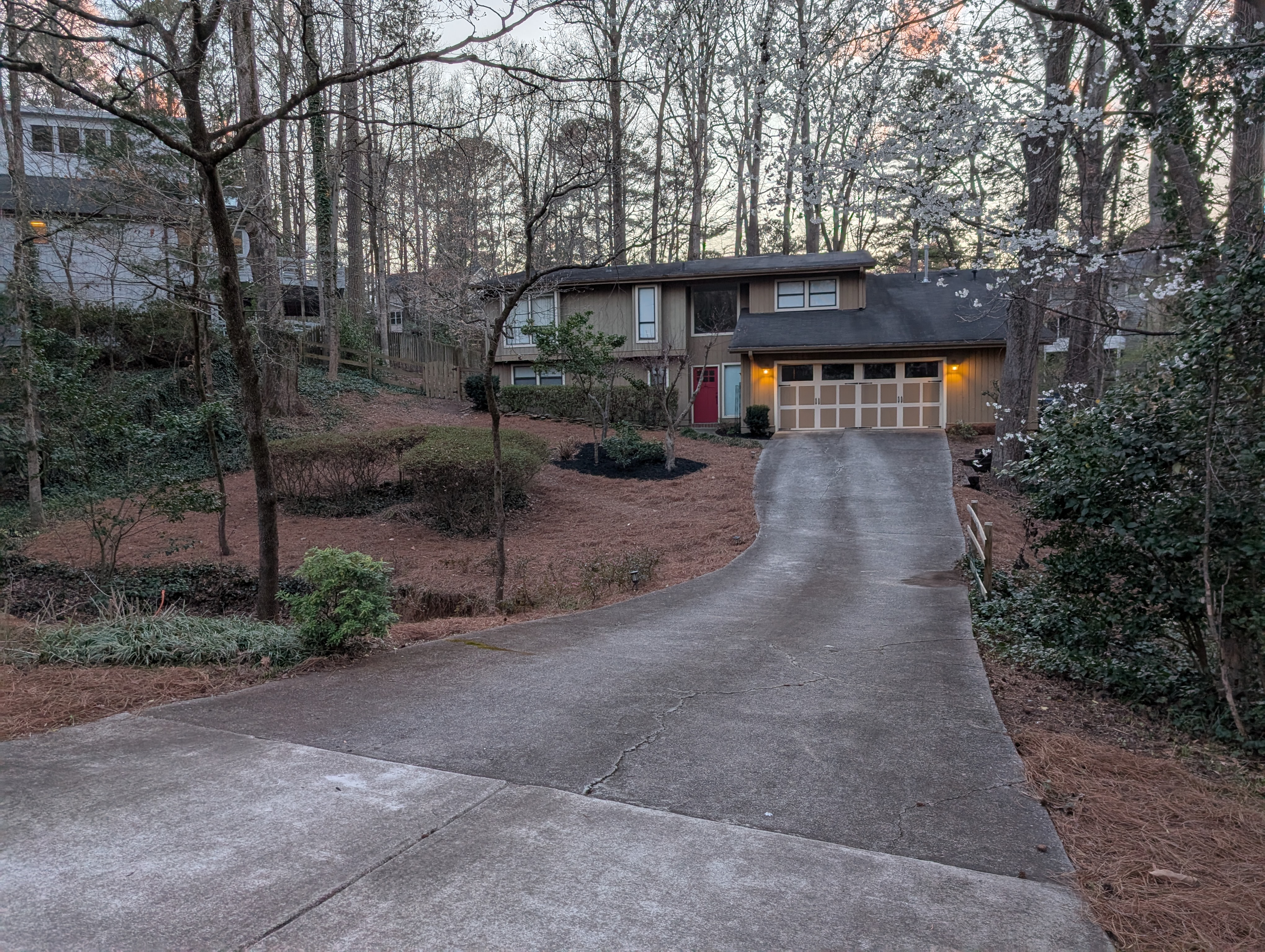 remove the section where you see the ditch goes underneath the driveway remove that section of the driveway and replace with a wooden bridge that matches the trim on the house in the background