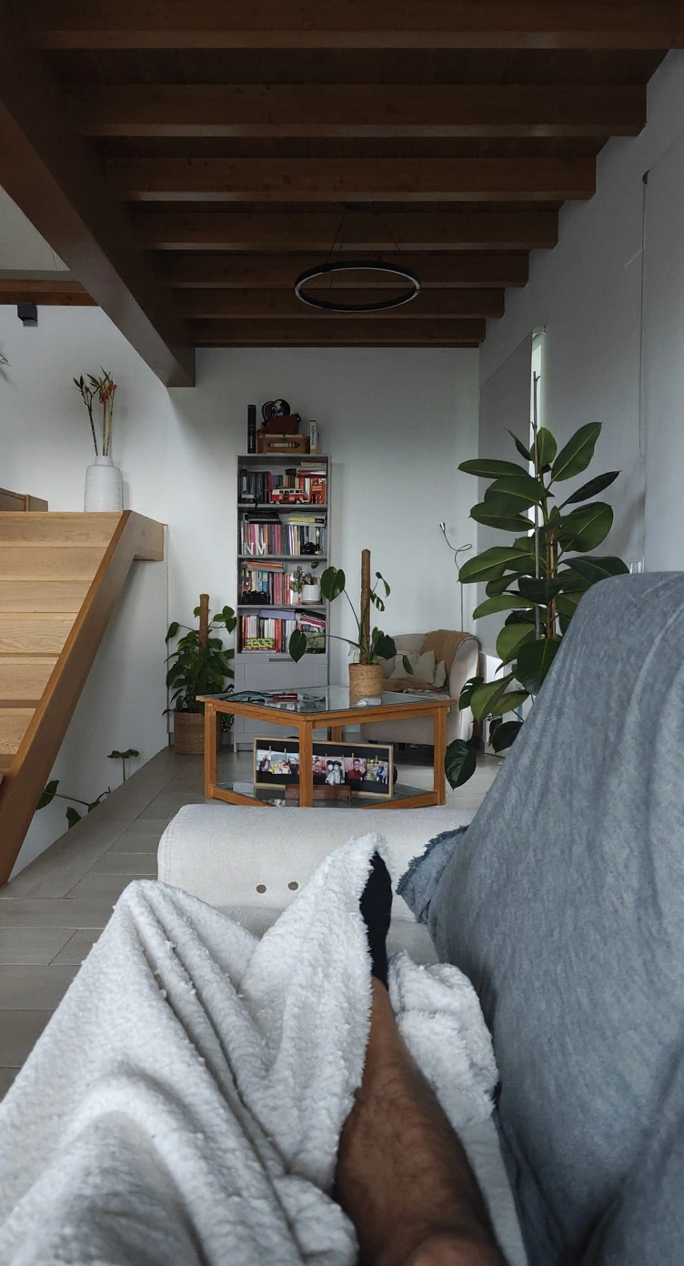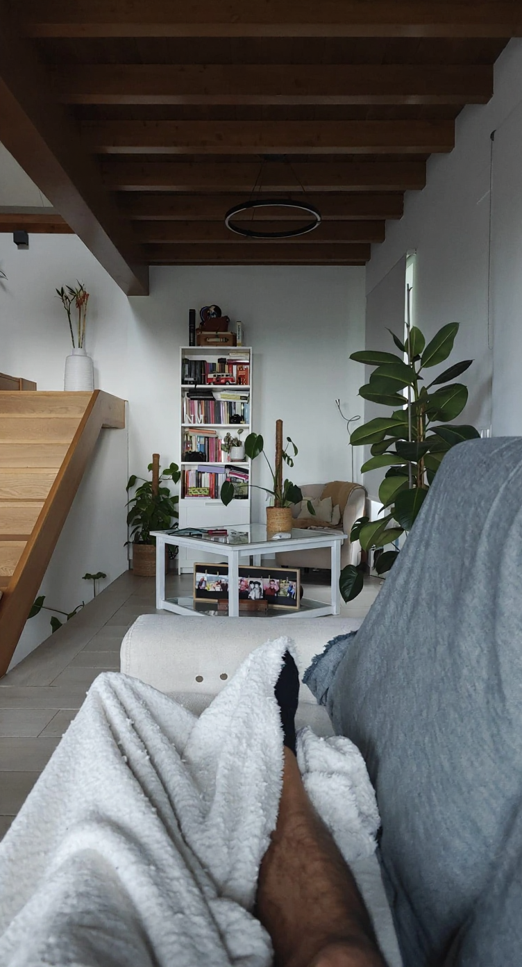 take off hte shelve and table and replace for a nice full wall shelve with plants and books close the stait with wood sticks something wuite bright not that sofa something escandinavian or modern style