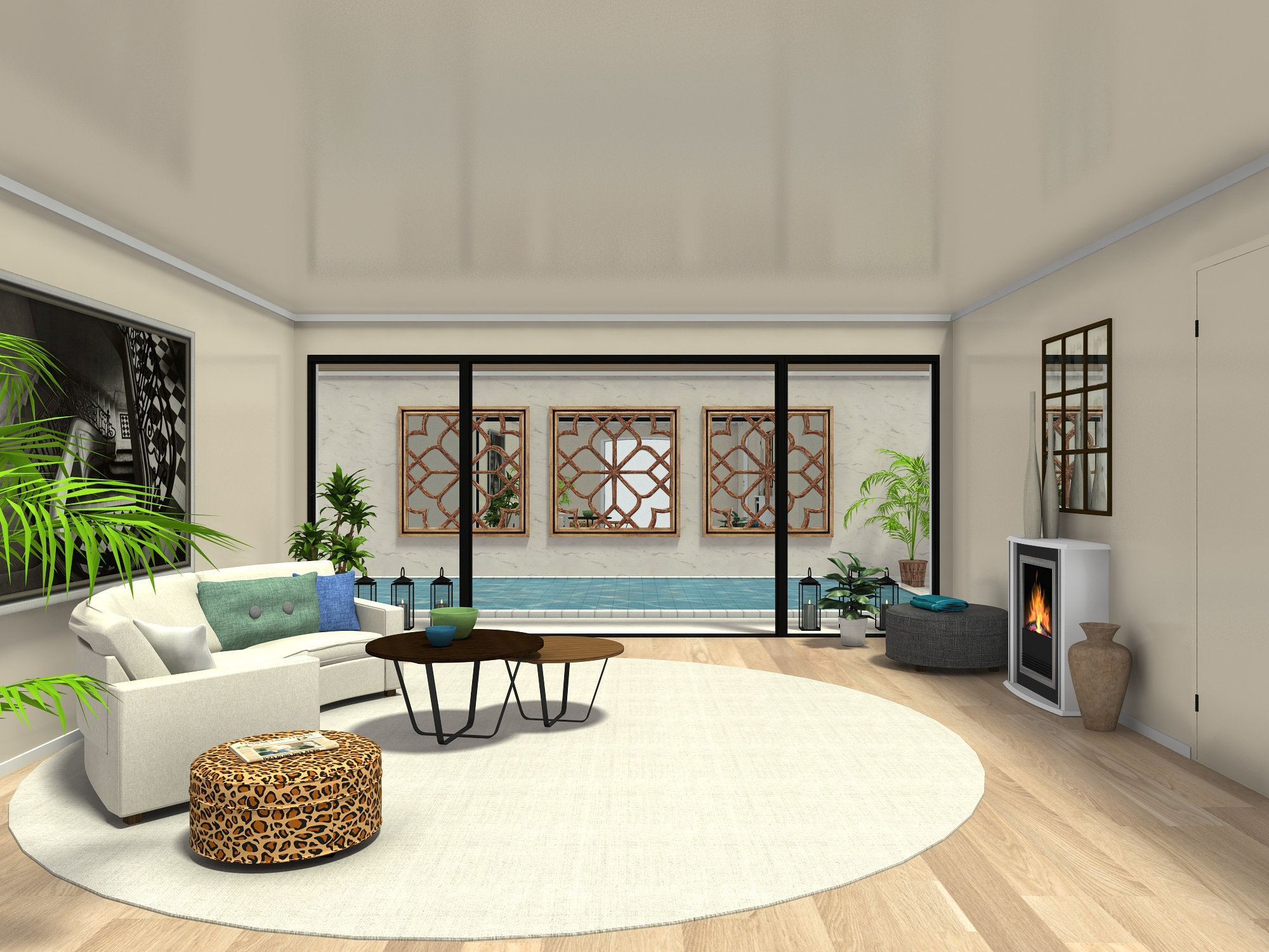 contemporary interior shot create a modern living room interior with a soft cozy atmosphere the walls are a light beige color the floor is a natural wood tone with a subtle grain a large round off white rug is centered in the room a comfortable light cream sofa is adorned with a mix of teal and white pillows a dark wood tone coffee table sits in front of the sofa to the side a small pouf with a bold leopard print pattern adds a touch of fun black framed sliding glass doors reveal a serene view of a pool and garden accented with lush green plants a minimalist white mantel hosts a gentle warm fire in the back decorative mirrors with intricate wooden frames reflect the natural light the atmosphere is inviting and tranquil infused with natural elements and a hint of elegance architecture